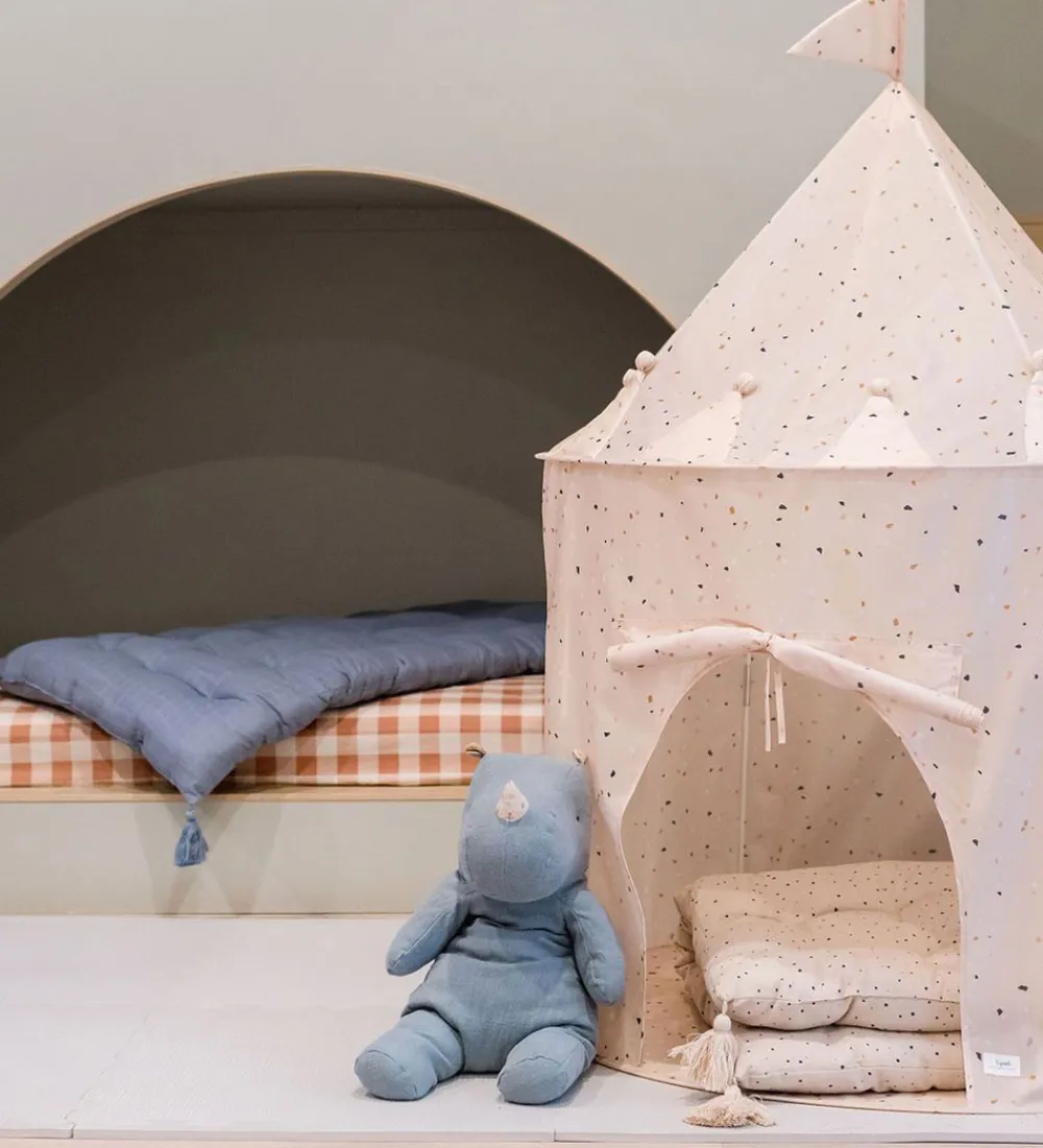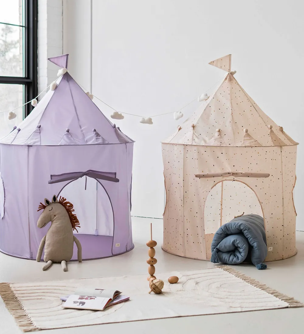 3 Sprouts legeteltet har en rund form med et spidst tag. På fronten er der en åbning med et stykke stof, som kan rulles op eller blive nede, og legeteltet har også to vinduer i mesh på siderne. Legeteltet indbyder til masser af leg enten alene eller sammen med vennerne, bamserne og dukkerne.