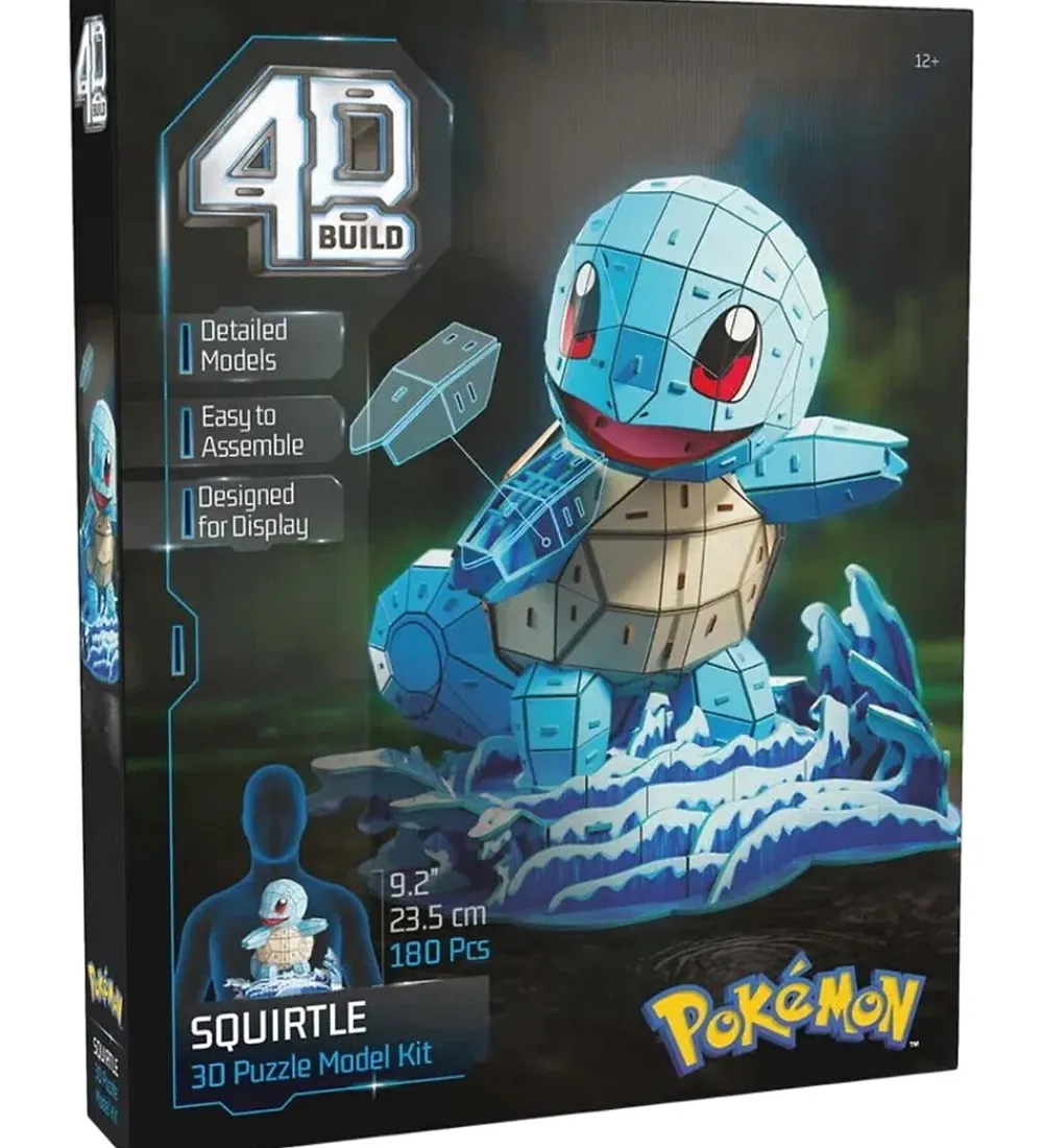 Flot 4D Puzzles puslespil med et detaljeret Squirtle-motiv i blå. Puslespillet fra 4D Puzzles er designet som et imponerende 3D-modelsæt, der indeholder 180 dele, som skal samles. Til puslespillet medfølger klistermærker, som sættes på brikkerne, så det samlet danner Pokémon-figuren Squirtle.