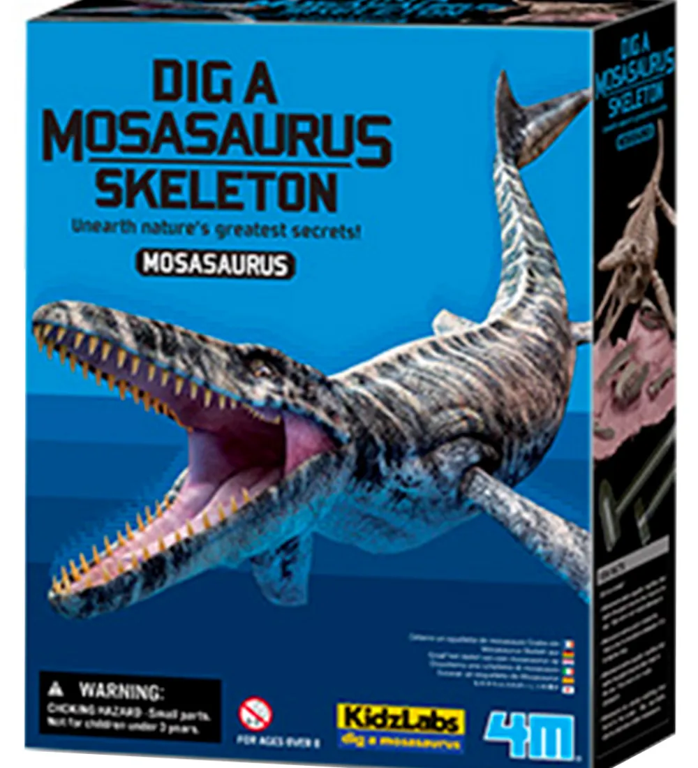 4M mosasaurus udgravnings sættet indeholder grave værktøjer og en stor sten, med et mosasaurus skelet i. Når skeletet er gravet fri kan det samles til en model som er 21 cm lang.
