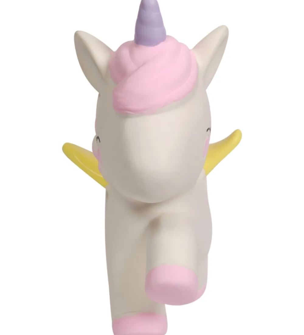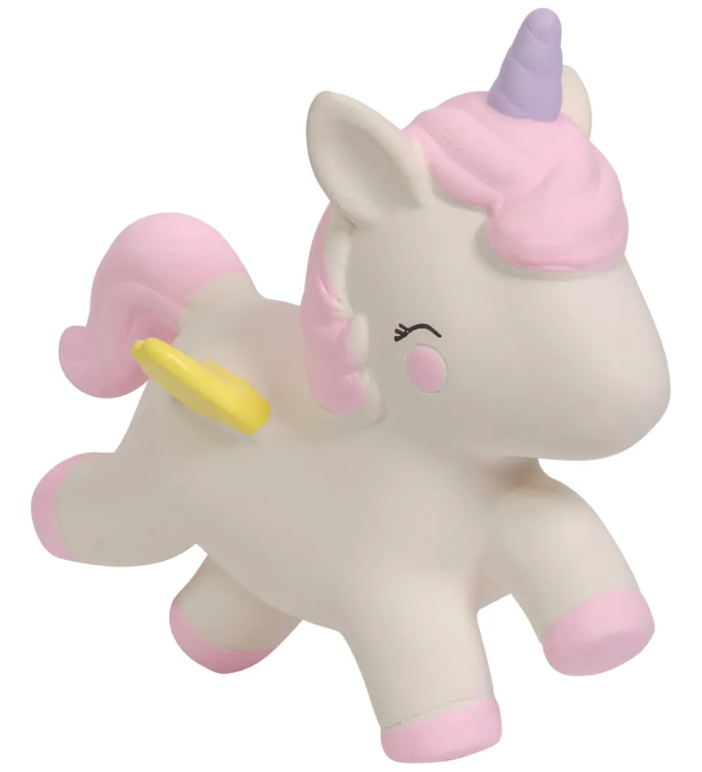 Sød A Little Lovely Company bidedyr i creme, rosa, lilla og gul med form som en enhjørning.