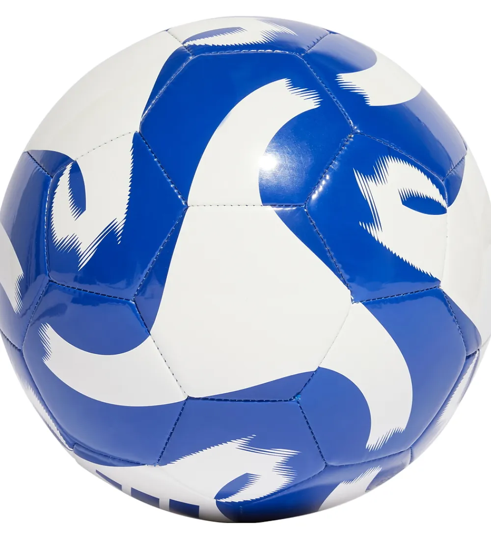Smart adidas Performance fodbold i hvid med et diskret ternet mønster og med et smart blåt print. Fodbolden har hvide logoer og teksten “Tiro Club”.
