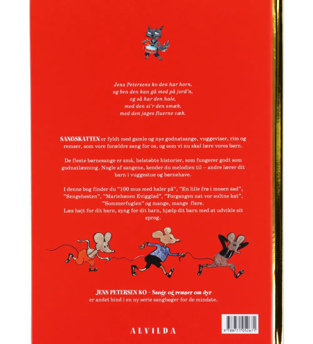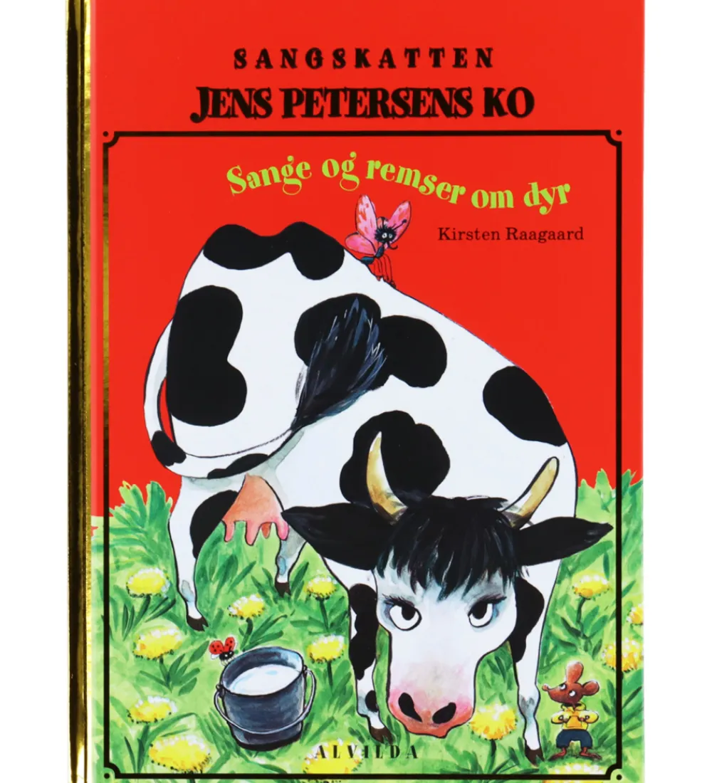 Skøn Alvilda bog med titlen “Sangskatten, Jens Pedersens ko”.