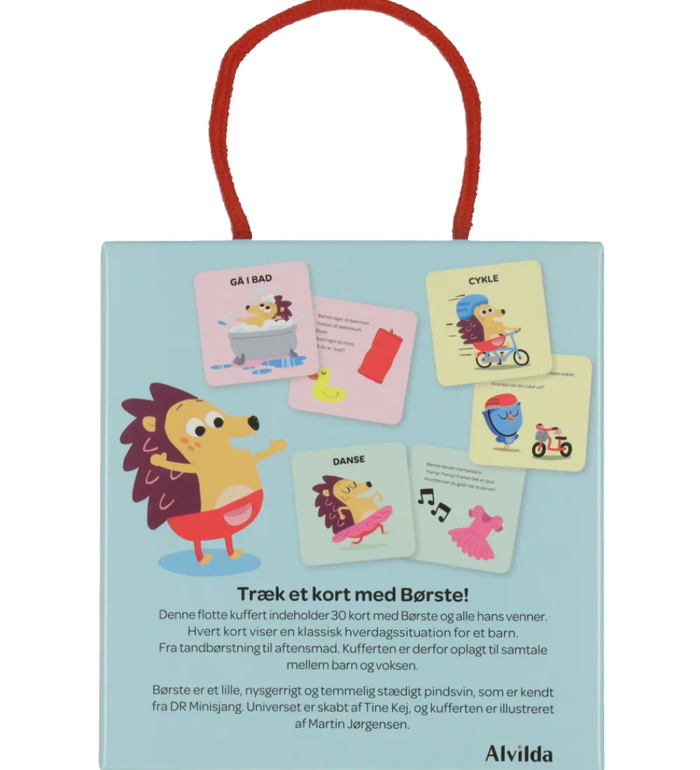 Alvilda kufferten indeholder 30 forskellige kort med Børste og alle hans venner. Hvert kort viser en klassisk hverdagssituation for et barn, alt fra tandbørstning til aftensmad, hvilket gør den ideel til samtale mellem barn og voksen.