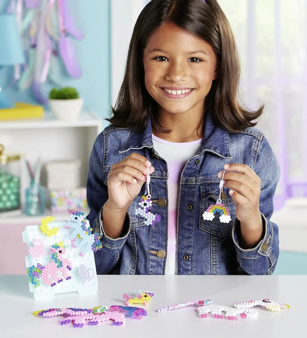Sjovt Aquabeads perlesæt i en enhjørninge-temaudgave til at lave figurer og nøgleringe. I pakken er der over 1500 runde, sekskantede og stjerneformede perler i forskellige farver (inkl. pastel) samt 1 perleplade, 1 vandspray, 1 kreationsdekorationsplade, 3 adaptere til nøgleringe og motivskabeloner.