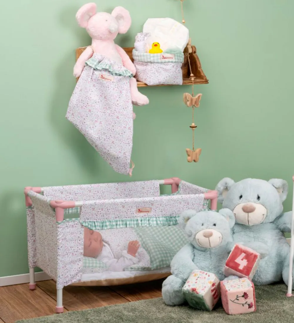 Sødt Asi dukketilbehør i form af en rejseseng i hvid med et blomstret design i rosa og grønne farver samt med detaljer med grønne tern.