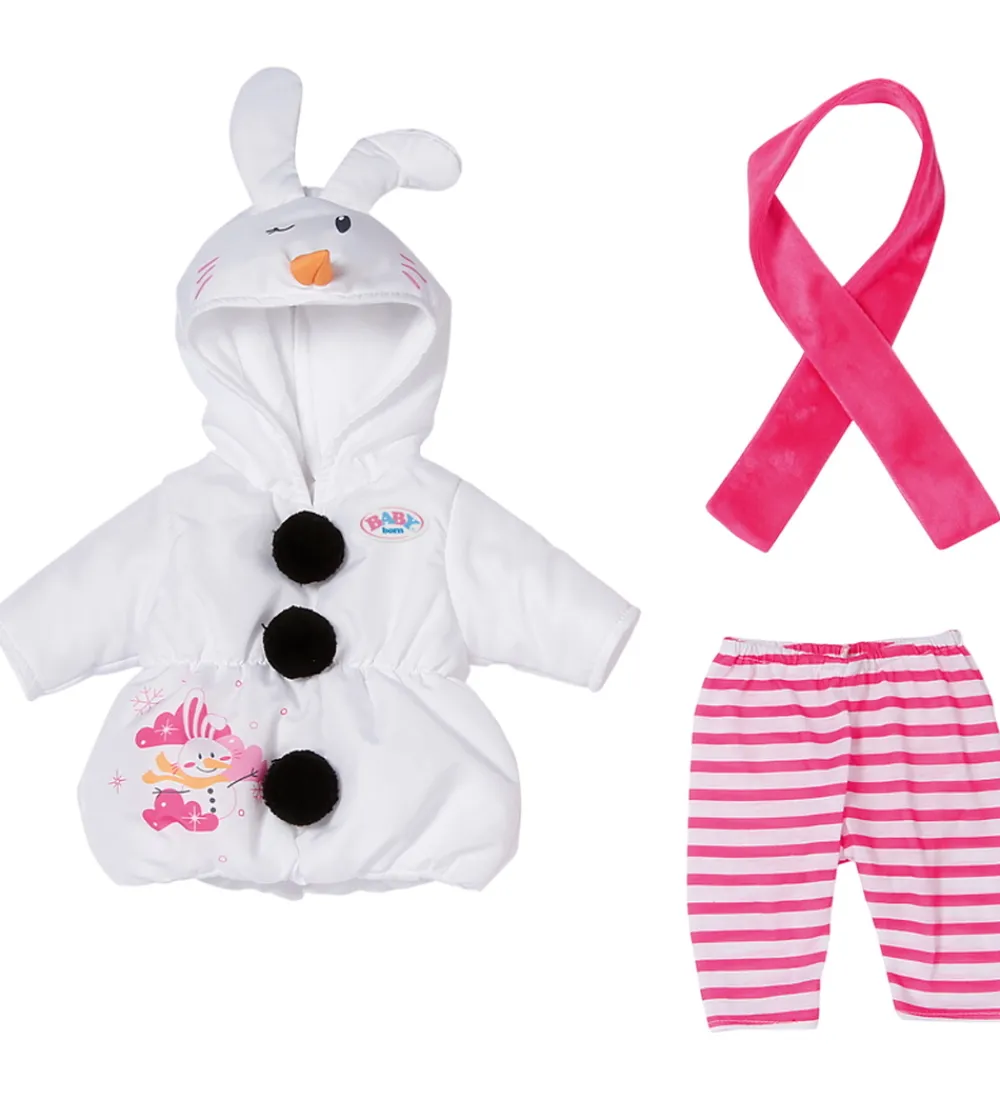 Skøn BABY born dukketøj med en hvid trøje udsmykket med sorte knapper og et fint kaninprint i pink. Sættet inkluderer desuden pink- og hvidstribede bukser og et matchende pink tørklæde.
