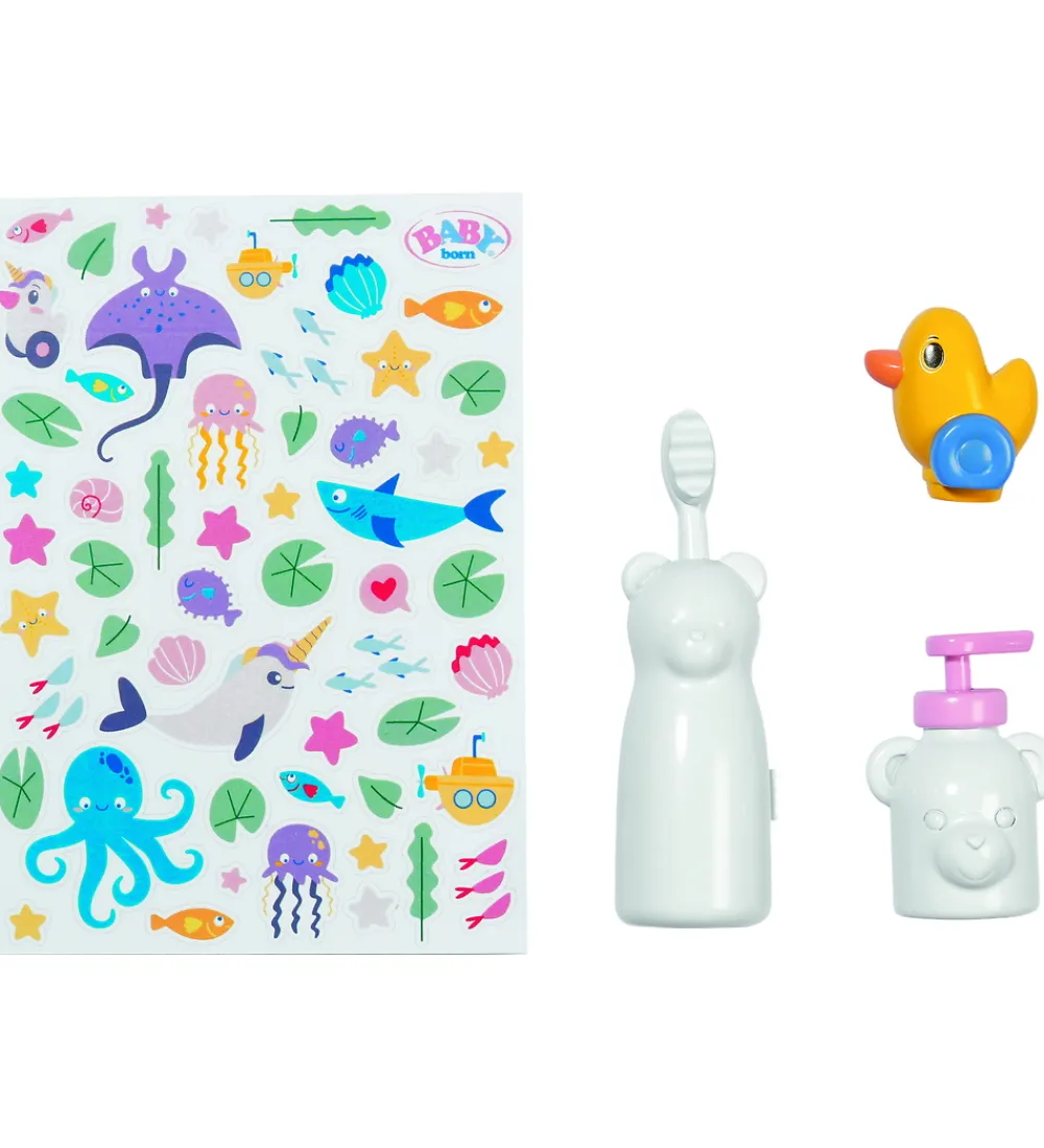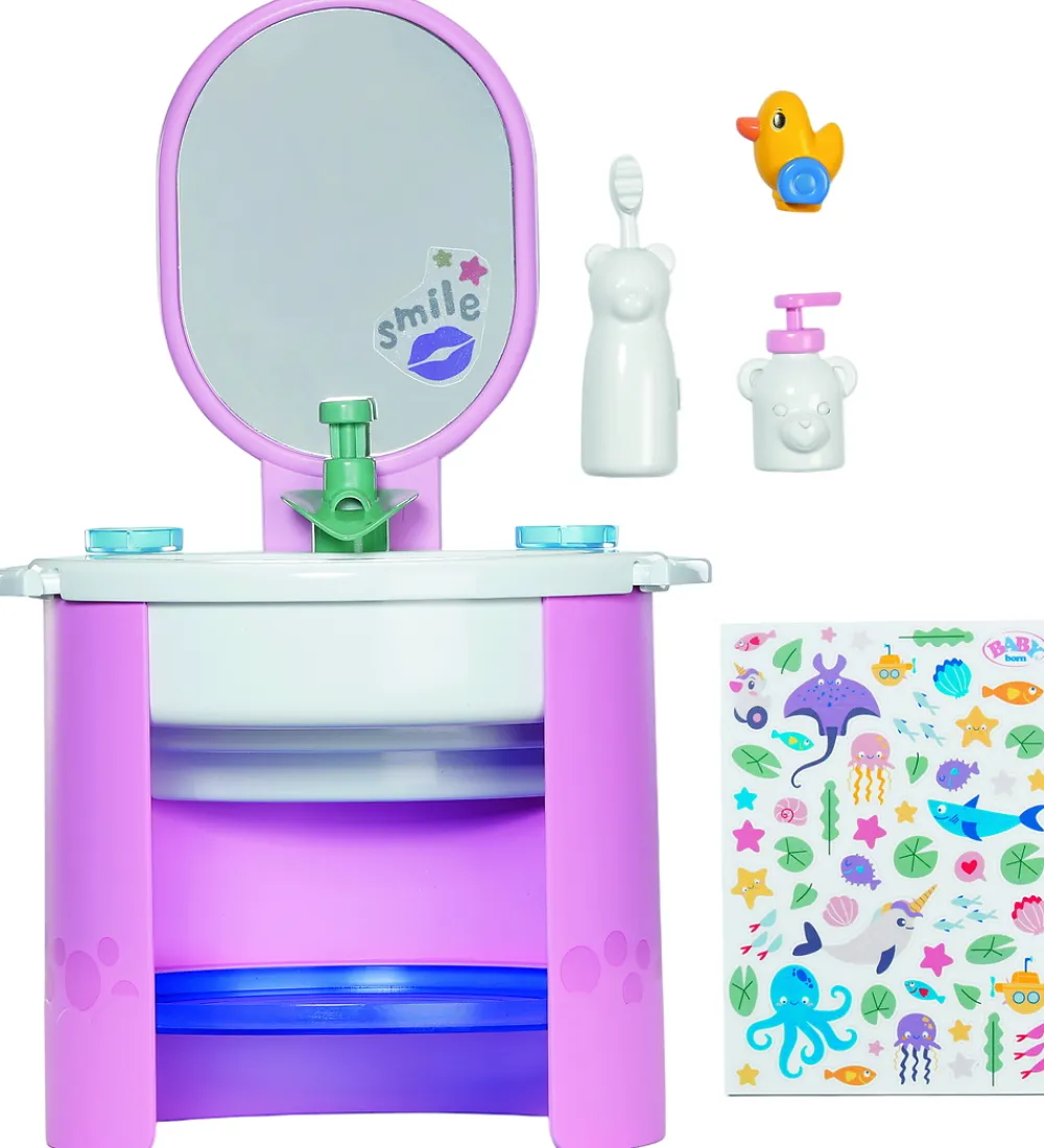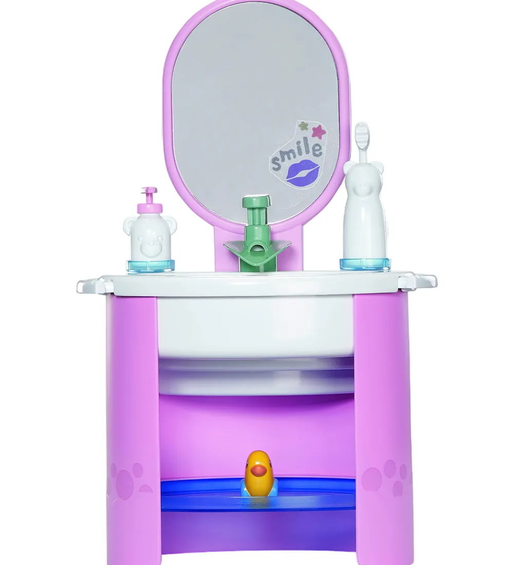 Der medfølger en sjov pop-op tandbørste til at børste dukkens tænder, og en sæbedispenser til at vaske hænser. Derudover har vasken en funktionel vandpumpe, så dukken rigtigt kan få vasket hænder med vand og sæbe.