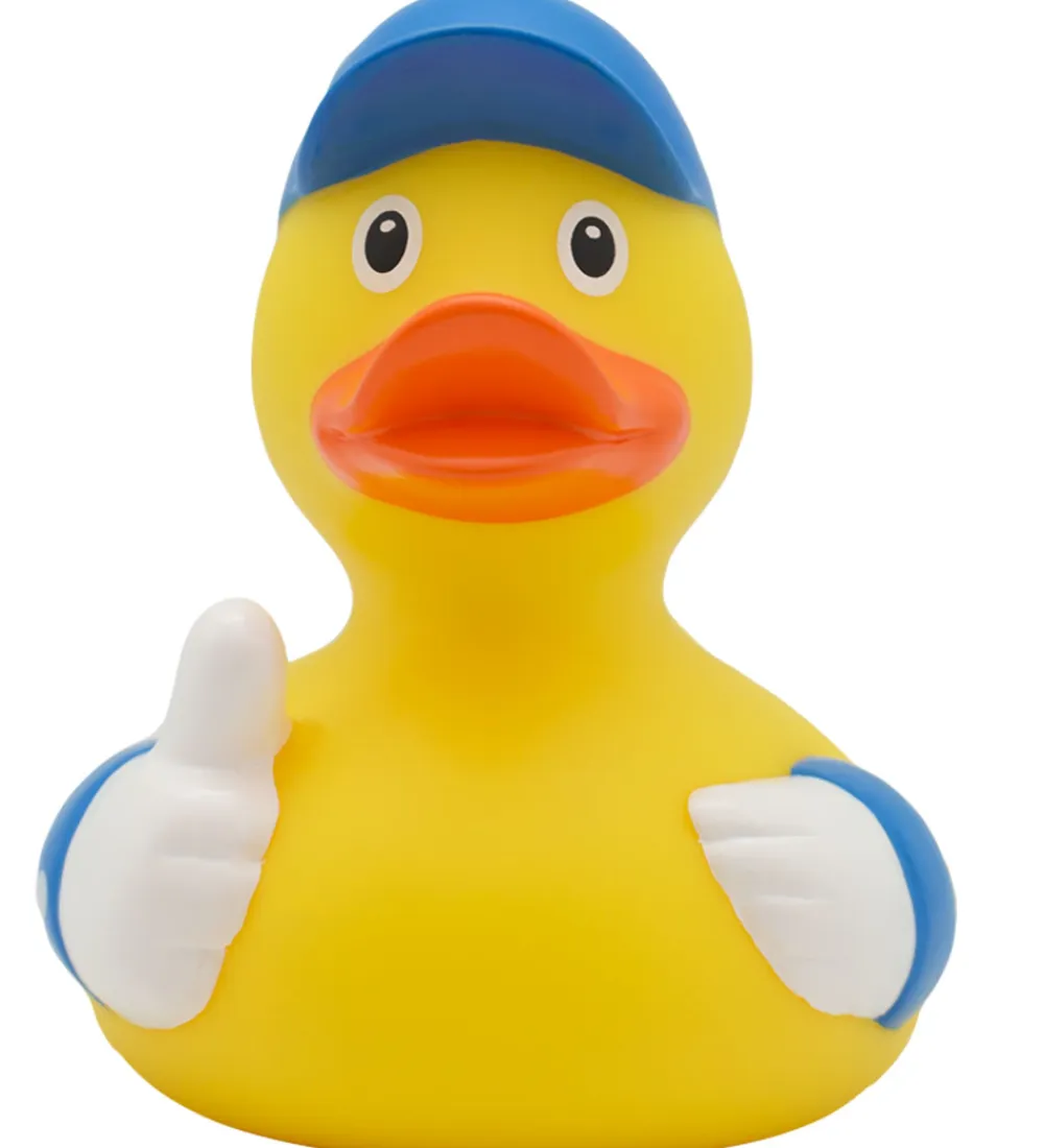 Sjov badeand i gul med en blå kasket der siger “LIKE” på fronten.