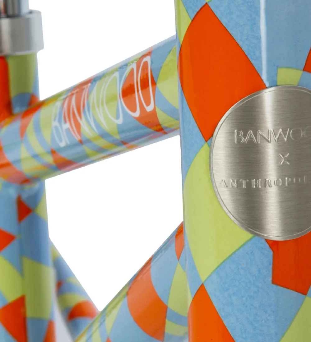 Smart Banwood løbecykel med et geometrisk mønster i gul, orange og himmelblå på stellet samt i hjulene. Dækkene er hvide og kurven, sadlen og håndtagene er brune.