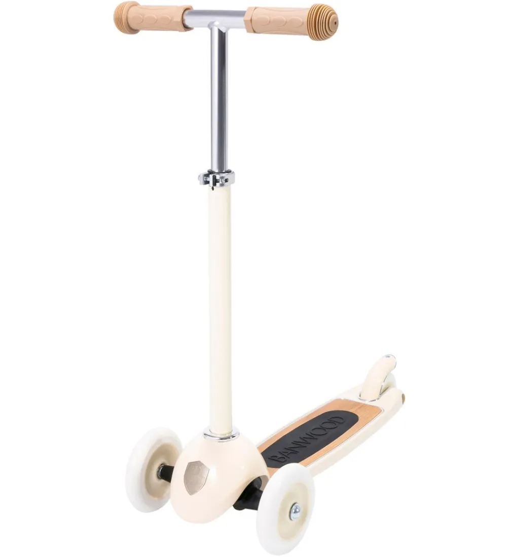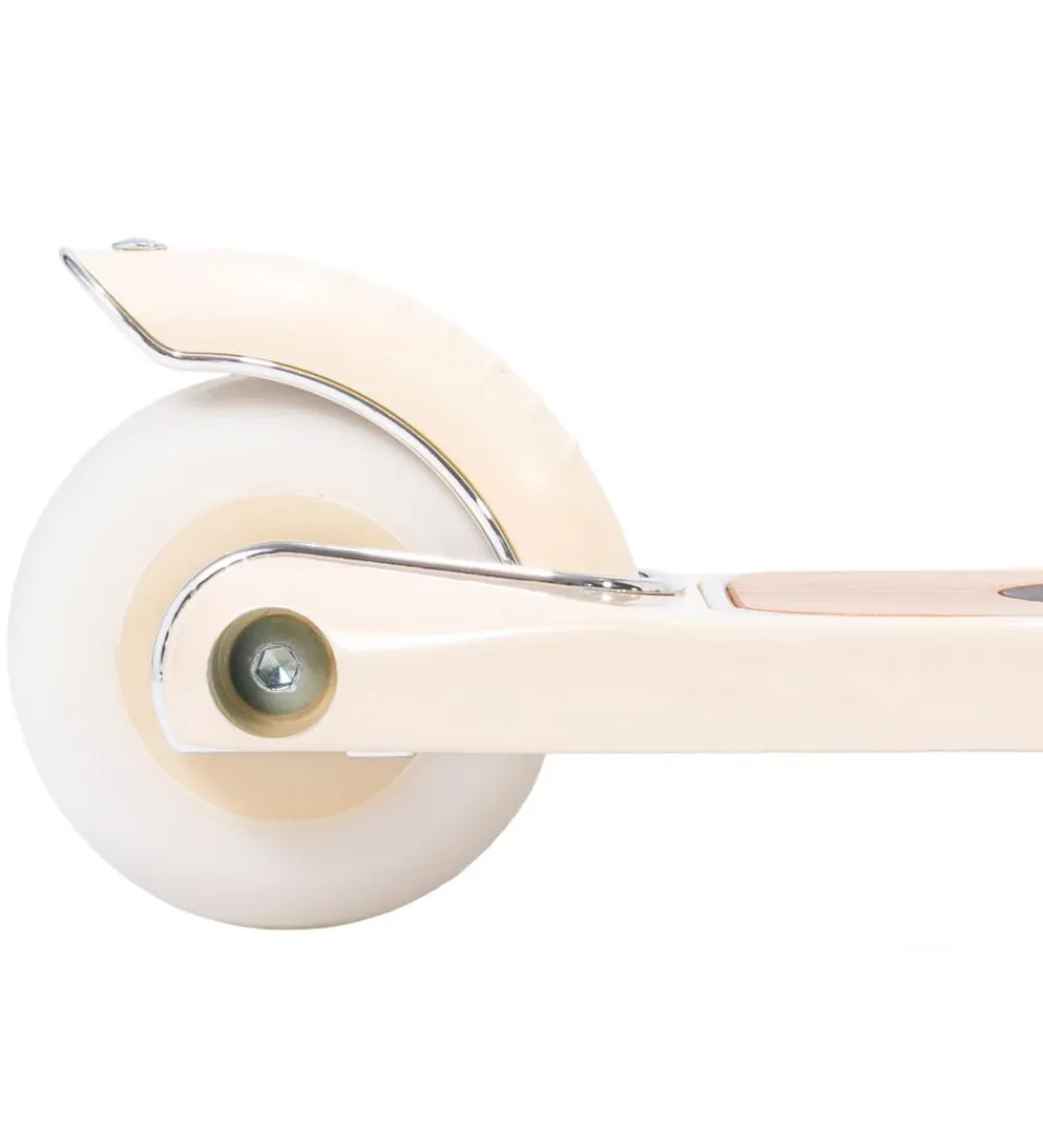 Banwood løbehjulet har to store hjul foran og et lille hjul bagpå med en fodbremse. Løbehjulet har en bred plade af eg med en sort gummistribe til at stå på, så barnet står stabilt. Styret kan justeres i tre højder, og det har håndtag af gummi, som giver et godt greb.