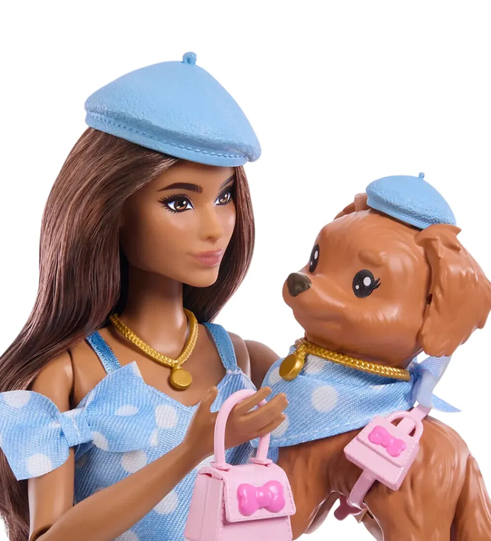 Flot Barbie dukke klædt i et charmerende, blåt sæt med hvide prikker. Barbie dukken inkluderer en sød hund med matchende accessories.