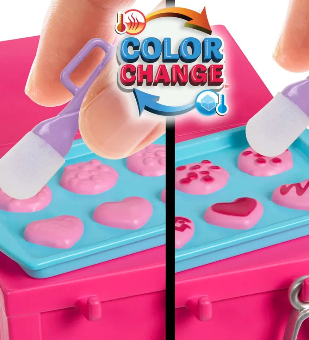 Sjovt Barbie dukkesæt bestående af en Barbie dukke i en lyserød kjole med forklæde og hvide sko samt et legekøkken, hvor der er flere end 20 forskellige tilbehørsdele, heriblandt madvarer og køkkenredskaber.