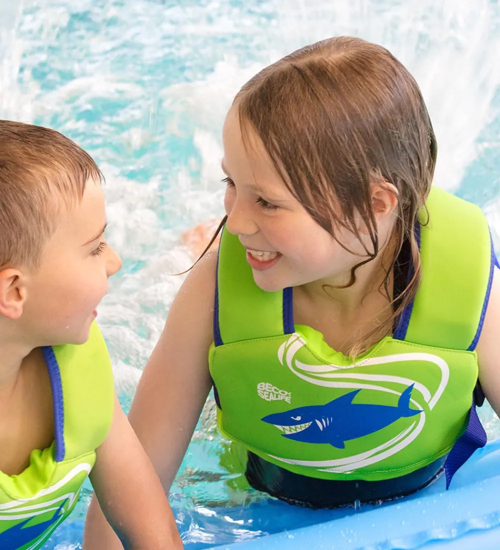 BECO svømmevesten er letvægtig, og den åbnes og lukkes ved hjælp af en justerbar rem med en kraftig spænde i den ene side. Svømmevesten er lavet af neopren med skum indvendigt, så det kan holde barnet op til vandoverfladen.