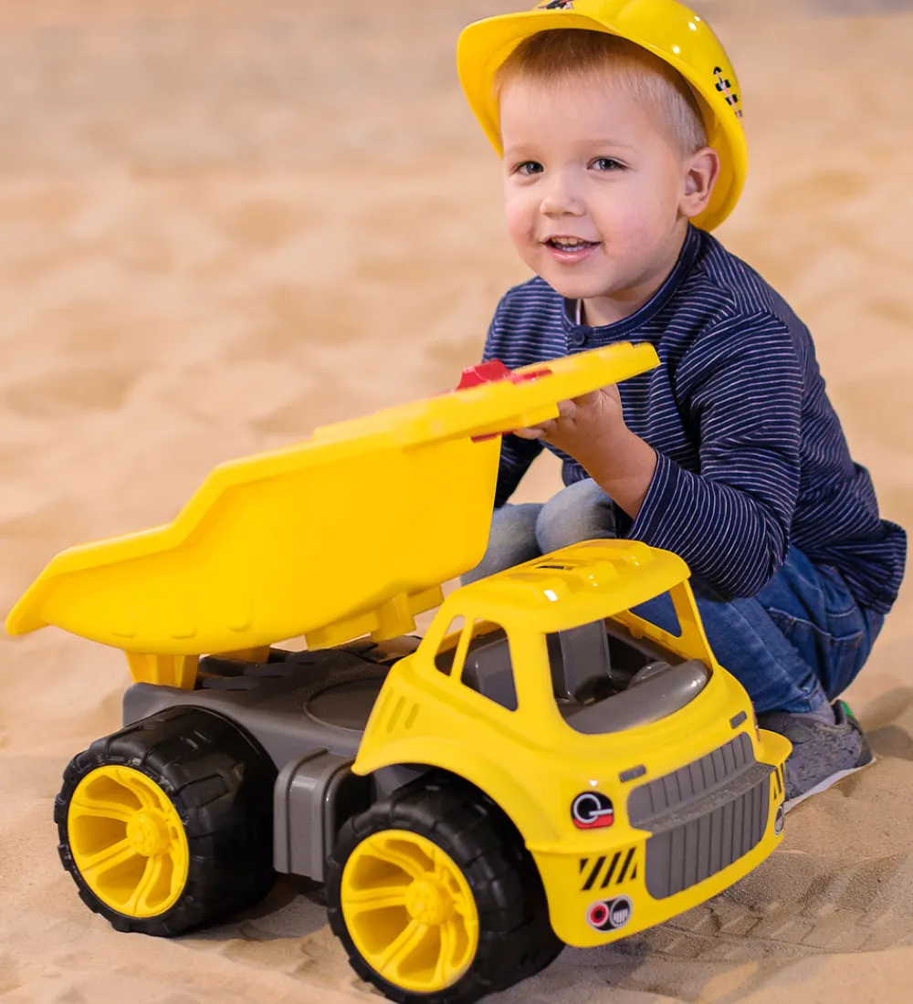 Sjovt BIG legetøj i form af en lastbil i gul, grå og sort.