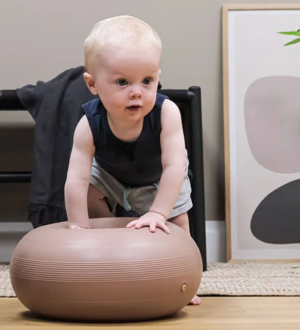 Hvis man trykker donutten ned mod gulvet, opstår der et vacuum, så den sætter sig fast. Så har man en sjov og stabil pude, der fungerer som afsæt til masser af tumleleg. Det er kun fantasien, der sætter grænser.