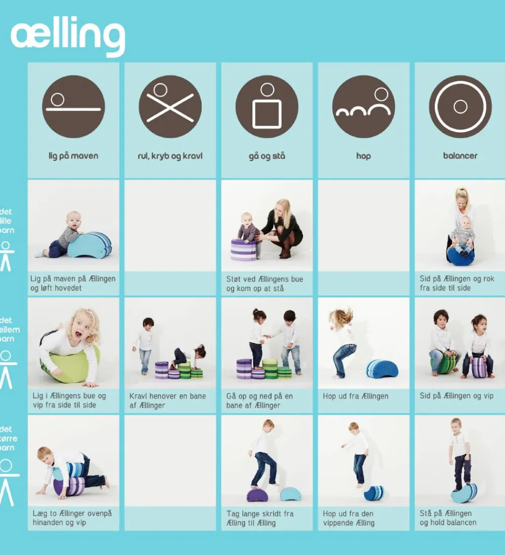 Ællingen har en buet form, så den er lige til at sidde og gynge på. De større børn kan også vove sig op at stå på den og forsøge at holde balancen. Hvis man vender ællingen om, bliver den til en lille bro, som man kan glide hen over, og de allermindste kan ligge hen over ryggen, så rygmusklerne bliver trænet.