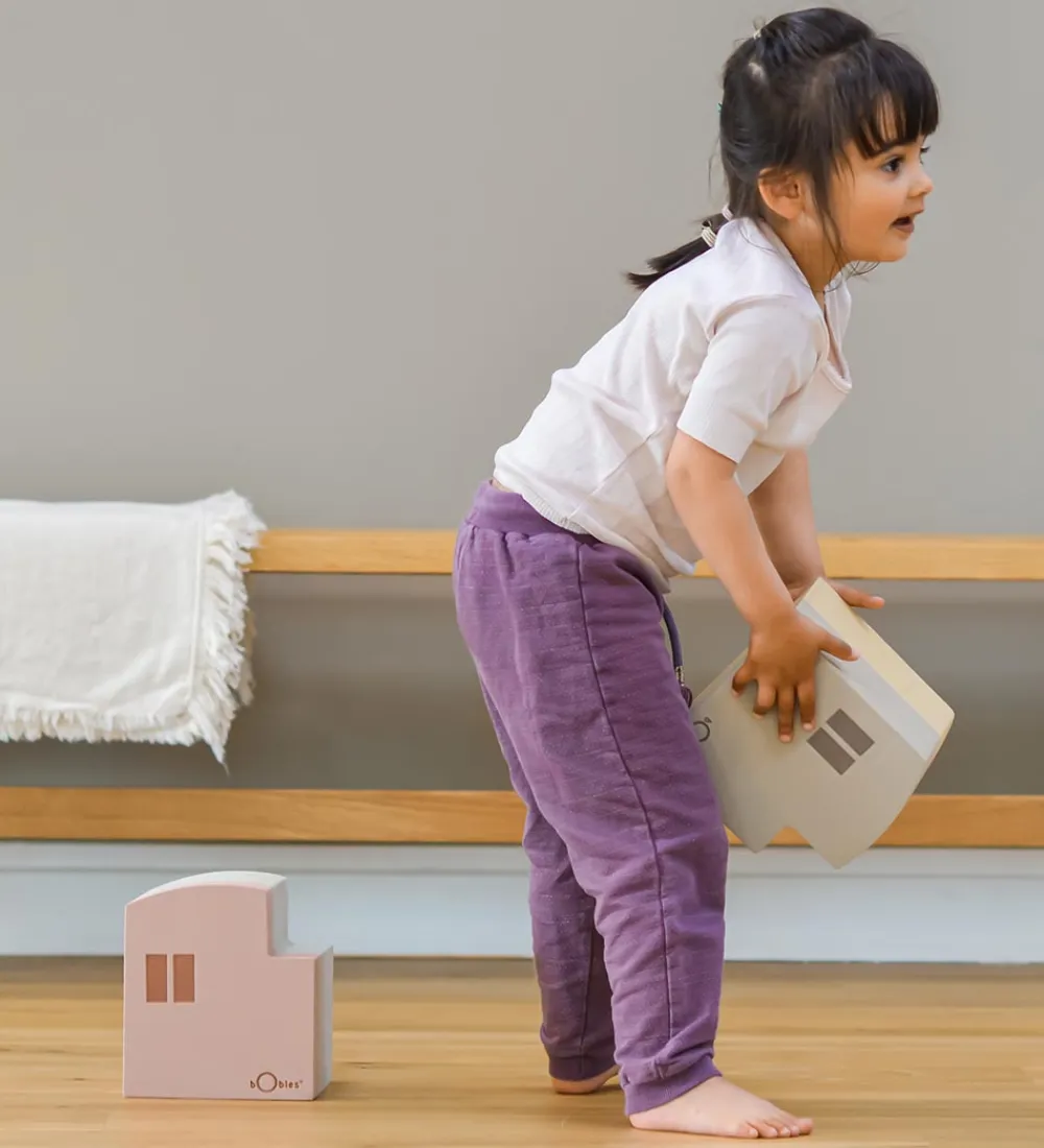 bObles tumlemøblet er dekoreret som et hus, og det er fladt i bunden, og i toppen er det buet. Det kan bruges som en lille skammel, eller som en del i tumlelege eller balancelege, og sammen med de andre figurer i serien kan man bygge sin egen by. Så er der lagt op til at slippe fantasien løs og udfordre motorikken.