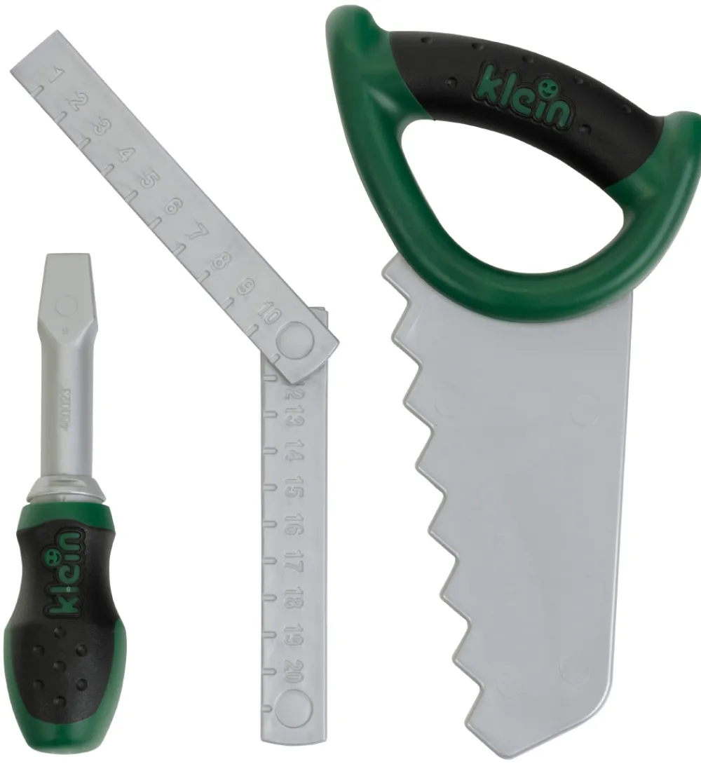 Sjovt Bosch Mini værktøjssæt bestående af en sav, en skruetrækker og en tommestok i grå og grønne nuancer.