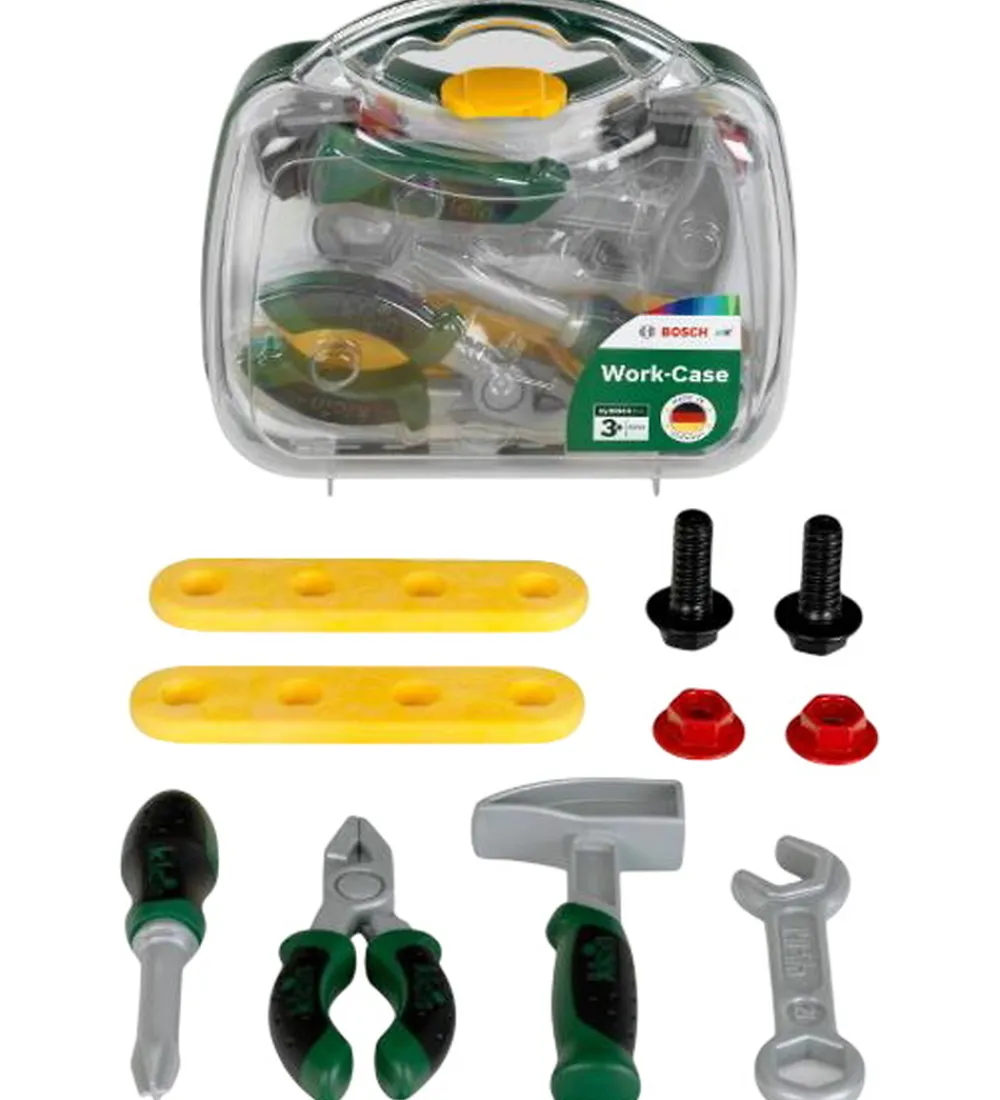 Bosch Mini legetøjs-værktøjskassen ligner de voksnes til forveksling og indeholder 10 stykker legetøjs-værktøj og tilbehørsdele: