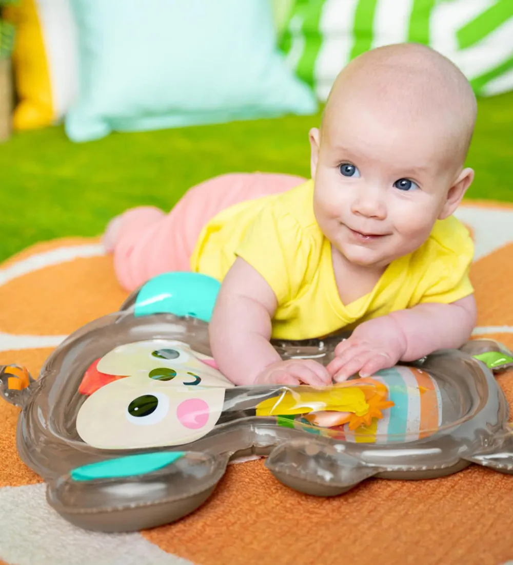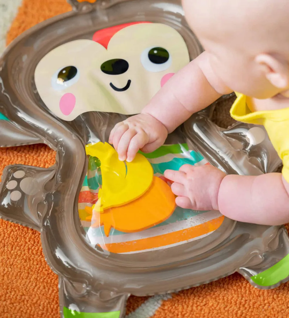 Bright Starts aktivitetsmåtten har en oppustelig kant og så kan den fyldes med vand i hovedet og maven, hvor de tre medfølgende, frugter kan blive skubbet rundt i vandet, når barnet ligger på måtten.
