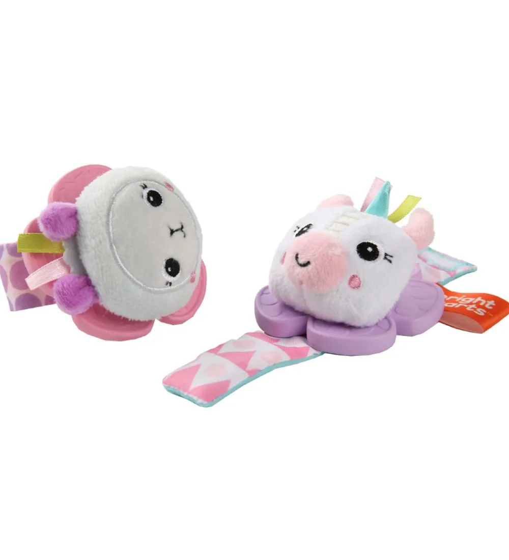 Bright Starts bideranglerne kan spændes om barnet arm med velcro, så barnet har en beskæftigelse lige ved hånden. Enhjørningens hoved knitrer, og lamaens hoved rasler. Omkring dyrenes hoveder er der blød silikone, som vil lindre barnets ømme og kløende gummer.