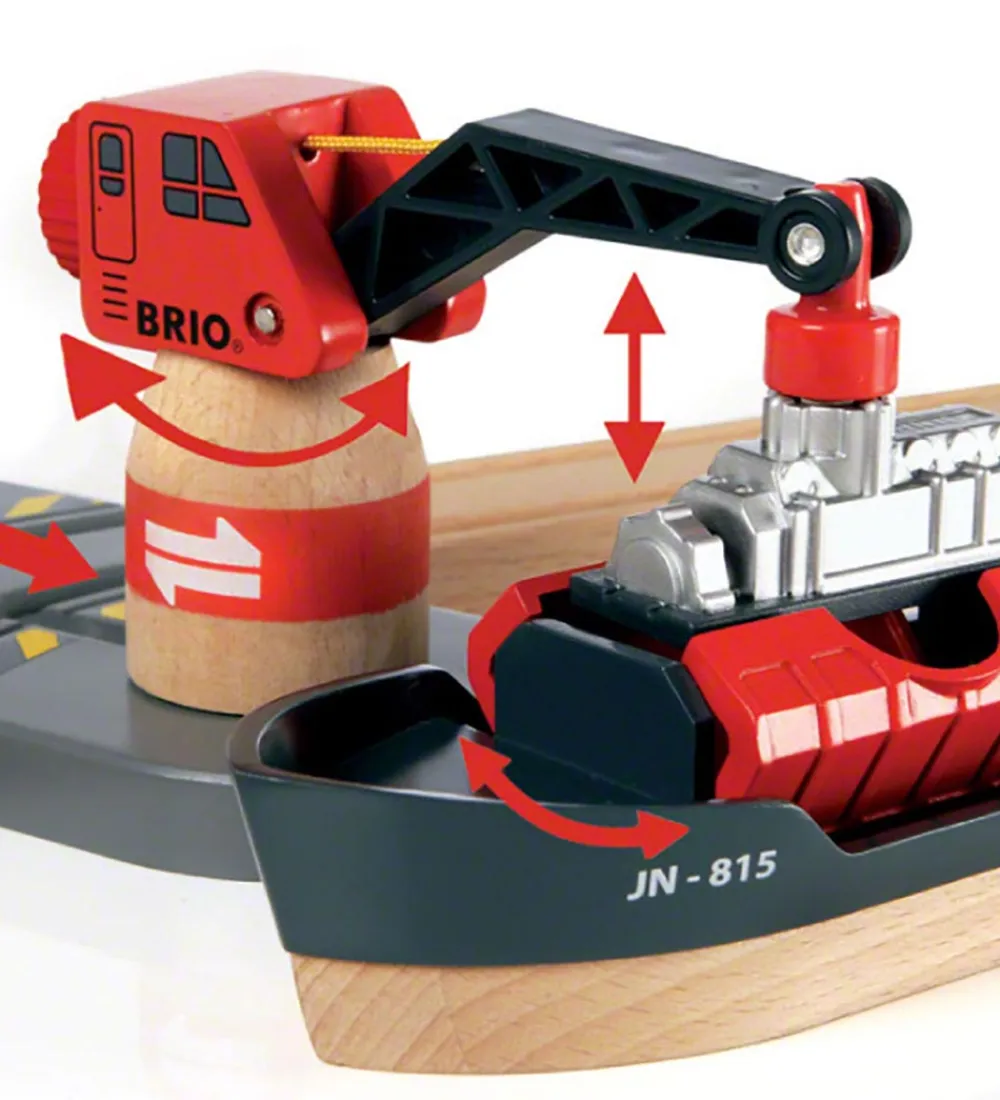 BRIO-sættet lægger op til masser af gode og kreative stunder. Med de mange togskinner sætter kun fantasien grænser for, hvordan barnet vil samle sin bane. Når det fine containerskib skal ind i havnen kan broen åbnes. Lasten fra containerskibet, kan læsses over til det batteridrevne lokomotiv. Når den nye last er læsset over til containerskiber igen, så kan skibet forlade havnen ved at broen kan åbnes igen. Toget og vognen har magneter, så de let kan sættes sammen. Toget kører ved at man trykker på toget.