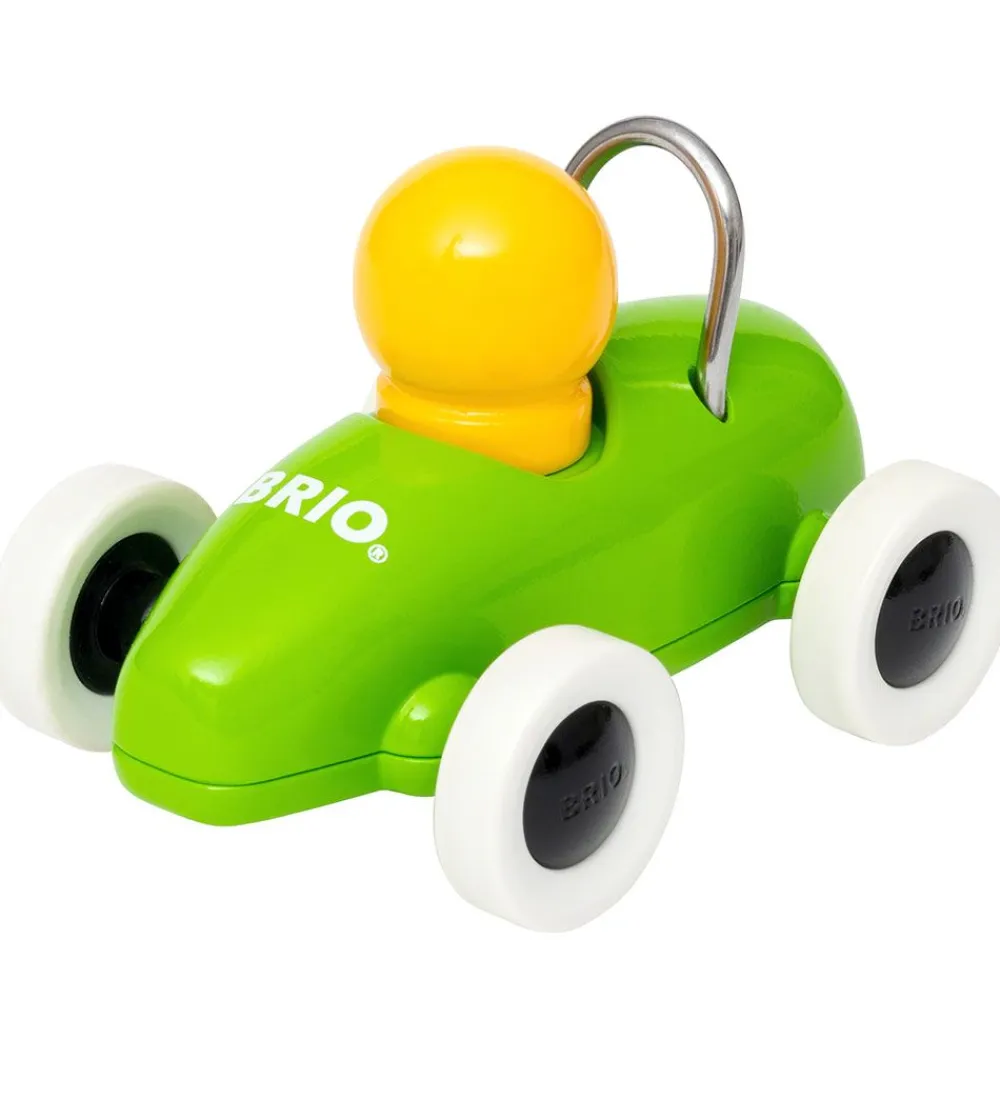 Fin BRIO træk og slip racerbil i grønmed en gul mand i.