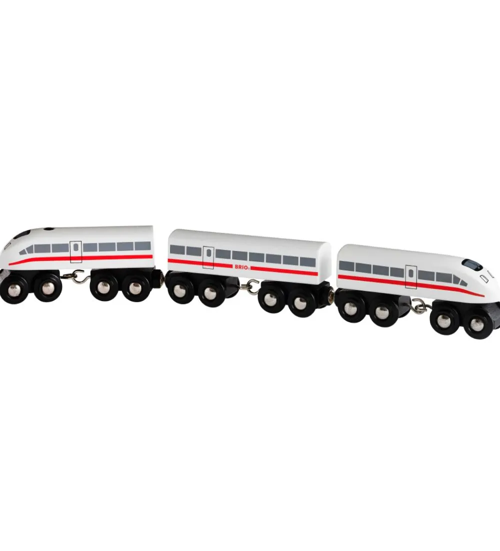 BRIO togets vogne har alle en magnet i enderne, så de let kan sættes sammen. Den ene vogn har en knap på toppen, som giver lyden af en togfløjte, når man trykker på den. Togets hjul roterer, så man kan køre rundt med det i hele huset.