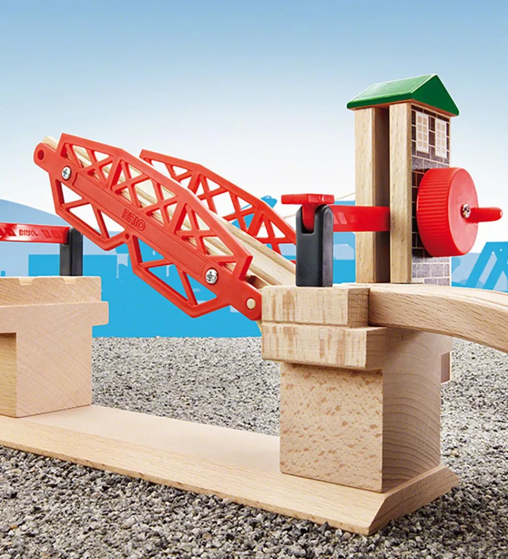 Før stopbommene ned og drej håndtaget for at løfte broen op. Indeholder 2 opfartsskinner, der passer til øvrige BRIO togbaner.