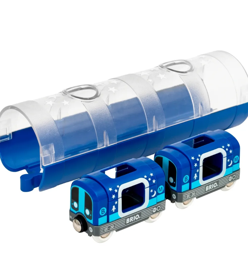 Smart BRIO metro m. tunnel i blå med detaljer i lyseblå, grå og selvlysende.