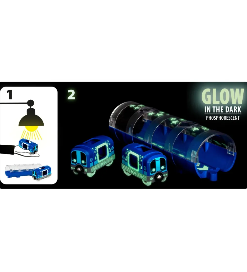 BRIO metroen m. tunnel har tre dele, de to tog og tunnelen. Alle tre dele har selvlysende dele.