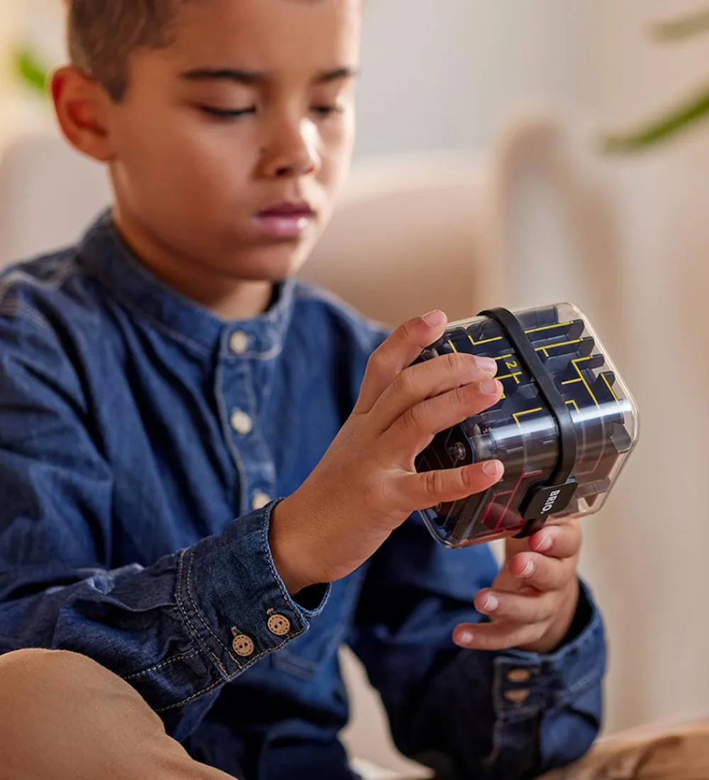 BRIO labyrinten består af en kube, og nu gælder det om at få den lille, sølvfarvede kugle gennem de indviklede gange, som spreder sig på alle seks sider af kuben.