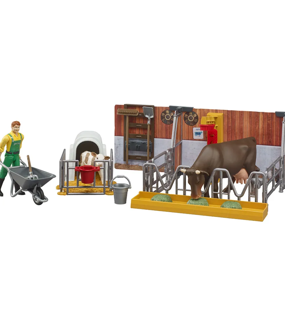 Sejt Bruder legesæt i serien bworld, der er en realistisk model af en stald med en bonde, en ko og en kalv samt flot tilbehør. Legesættet fremstår fuldstændig som den ægte vare i størrelsesforholdet 1:16.