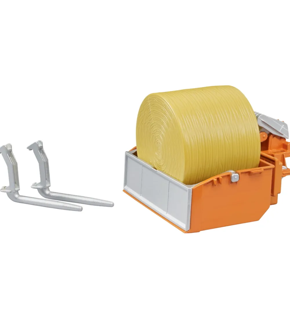 Sej Bruder Traktorlæssekasse og gafler i orange samt en gul rundballe.