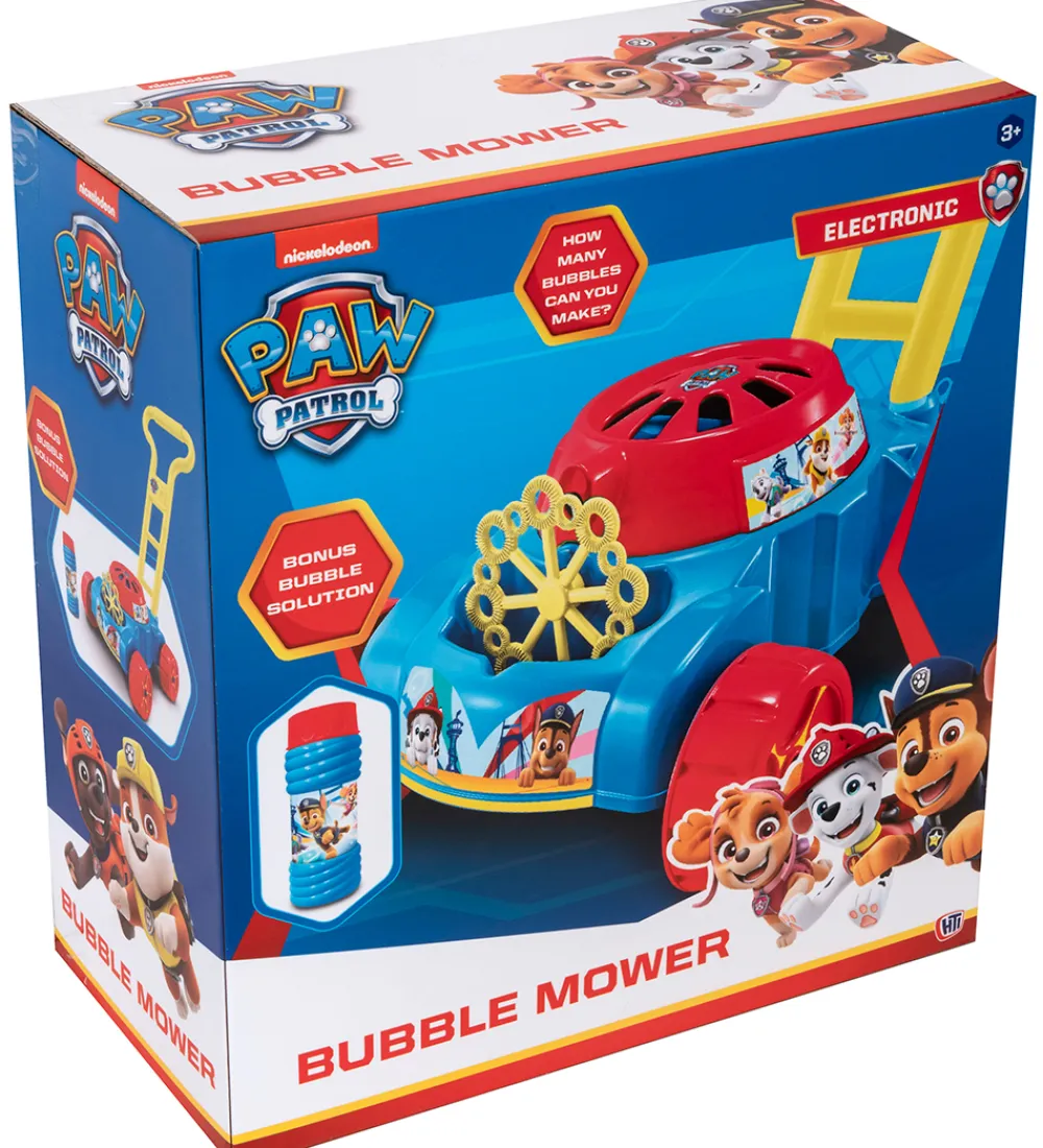 Sjovt Bubbles sæbeboblemaskine der ligner en plæneklipper, med et flot Paw Patrol tema.