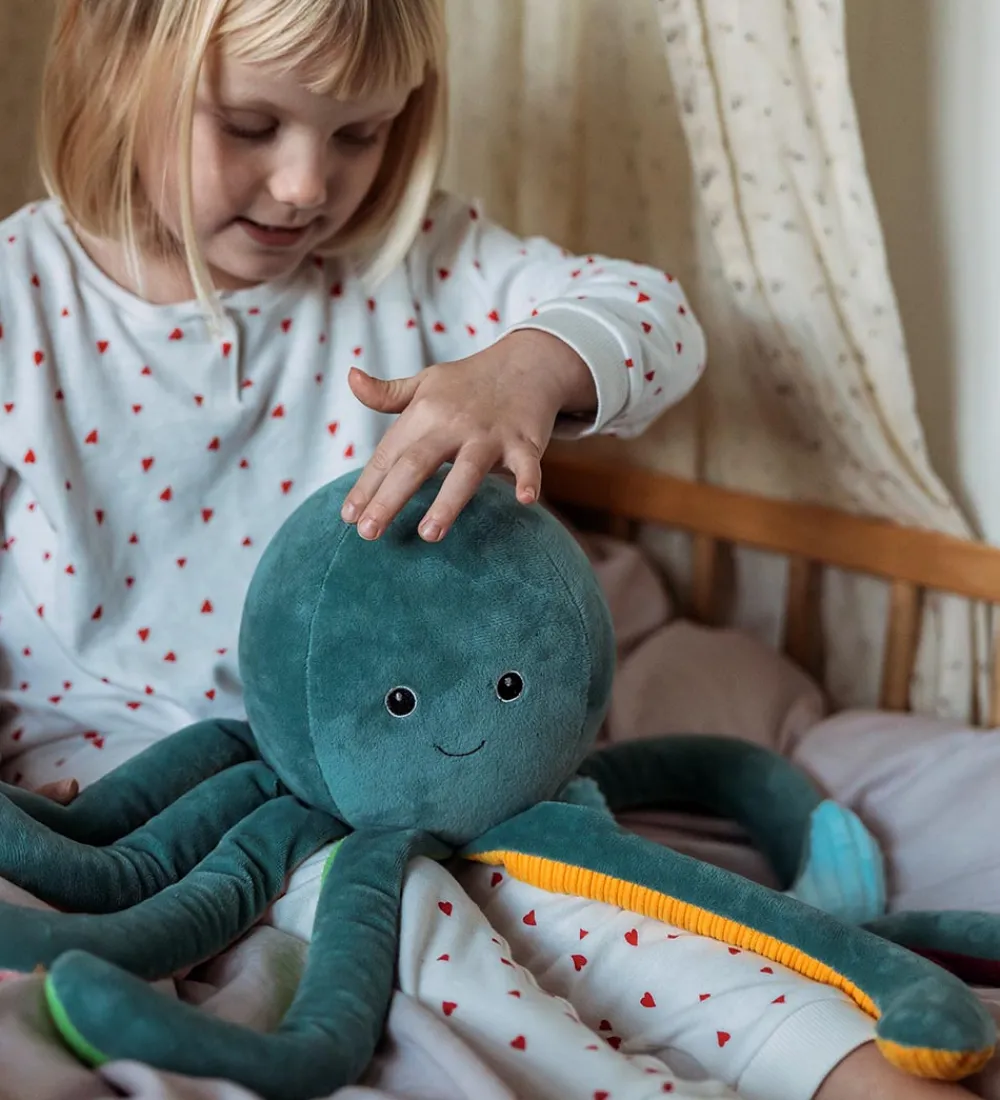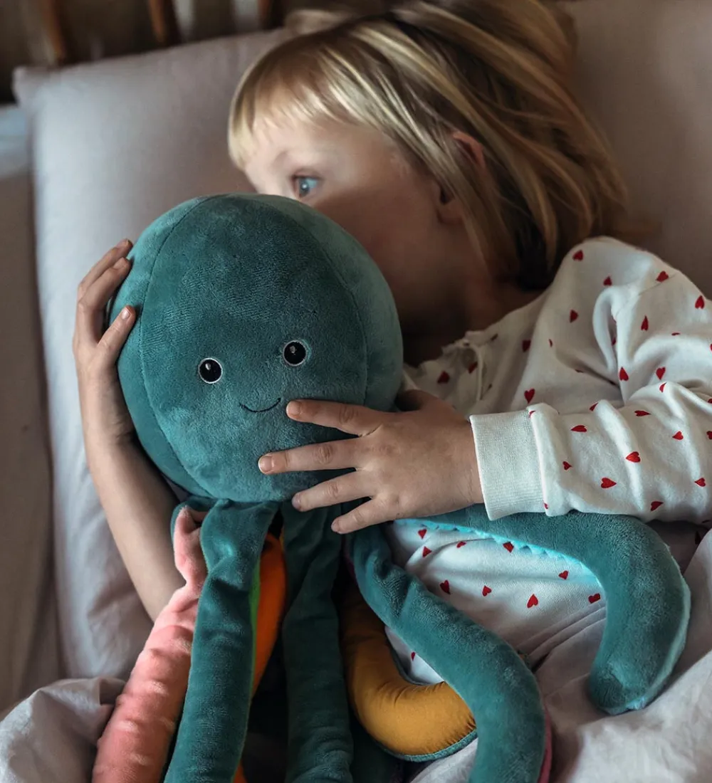 Skøn by Astrup bamse formet som en aquagrøn blæksprutte, og undersiden af dens ben er lavet af forskellige materialer med sjove strukturer og i klare farver.