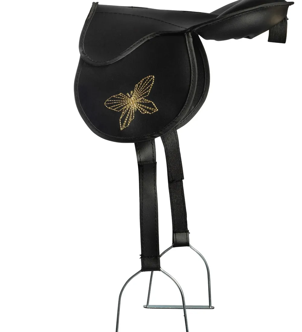 Smart by ASTRUP sadel til brandets flotte kæpheste. Sadlen er sort, imiteret læder med guldlogo og metalbøjler.