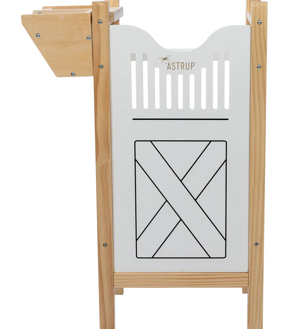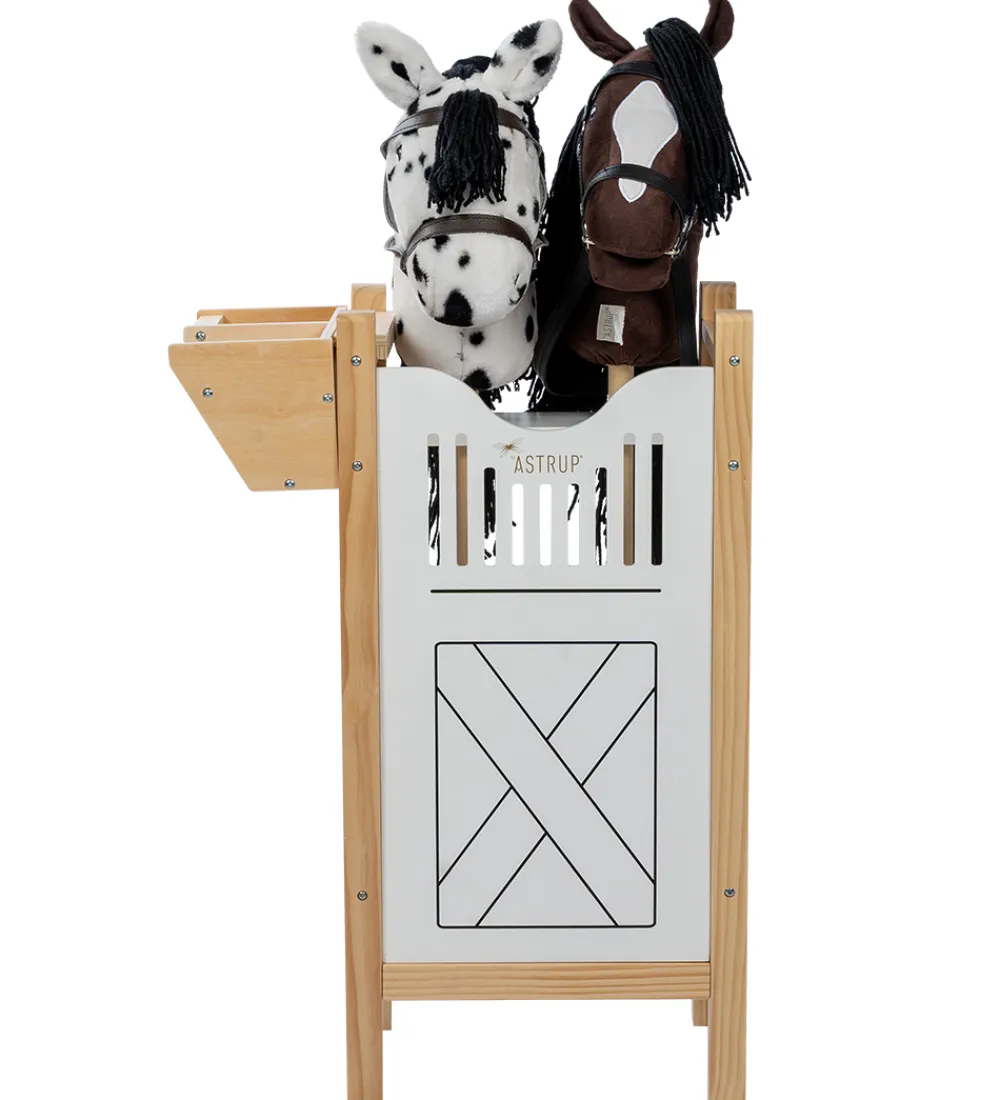 by ASTRUP hesteboksen har en robust konstruktion og passer til alle kæpheste, uanset længden på deres pind. På den ene side er der et udhæng til foder til hestene. Hesteboksen er et godt hjem til kæphestene, hvor de kan stå og spise og blive friseret.