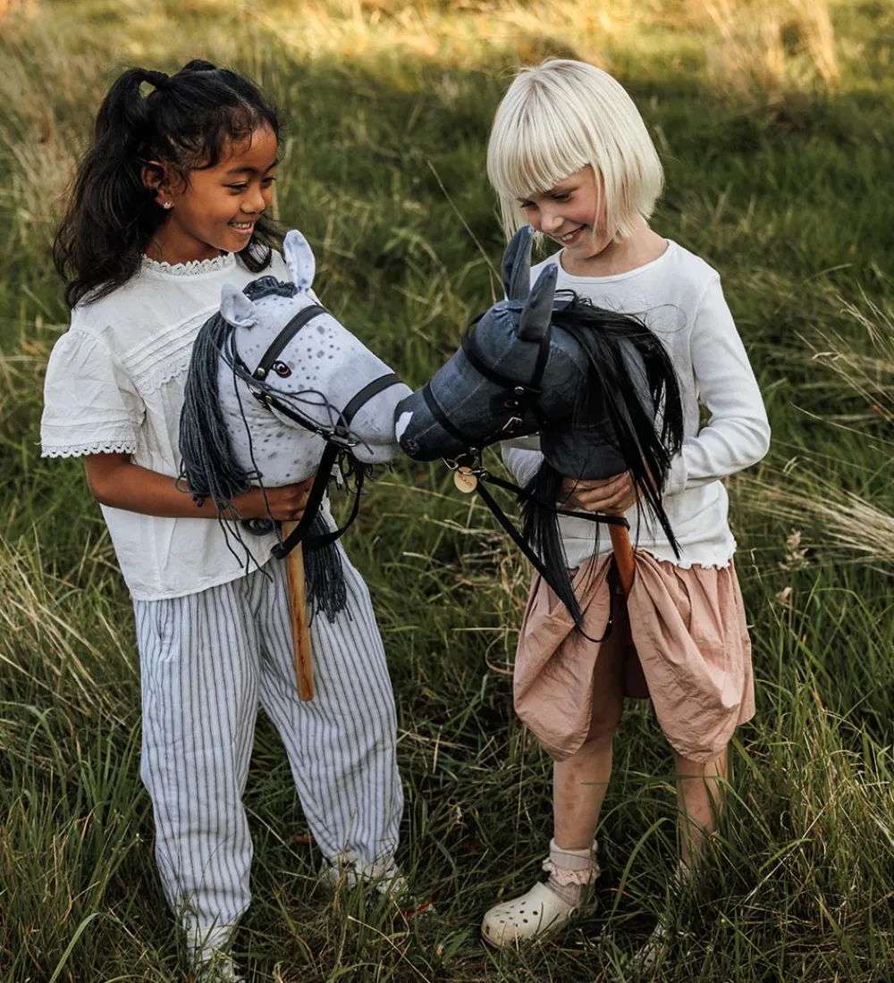 by ASTRUP kæphesten har sort hovedtøj på, som kan tages af og på. På den ene side af hovedtøjet sidder et rundt navneskilt med navnet “Blaze” på den ene side og by ASTRUPs logo på den anden side. Kæphesten har et blødt hoved med en manke af nylon som kan friseres og sættes i flotte frisurer. Kæphesten er skabt til fantasifulde og kreative lege.