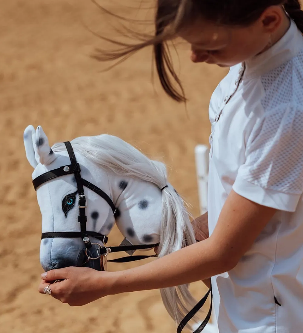 by ASTRUP kæphesten har sort hovedtøj på, som kan tages af og på. På den ene side af hovedtøjet sidder et rundt navneskilt med navnet “Magic” på den ene side og by ASTRUPs logo på den anden side. Kæphesten har et blødt hoved med en manke af nylon som kan friseres og sættes i flotte frisurer. Kæphesten er skabt til fantasifulde og kreative lege.