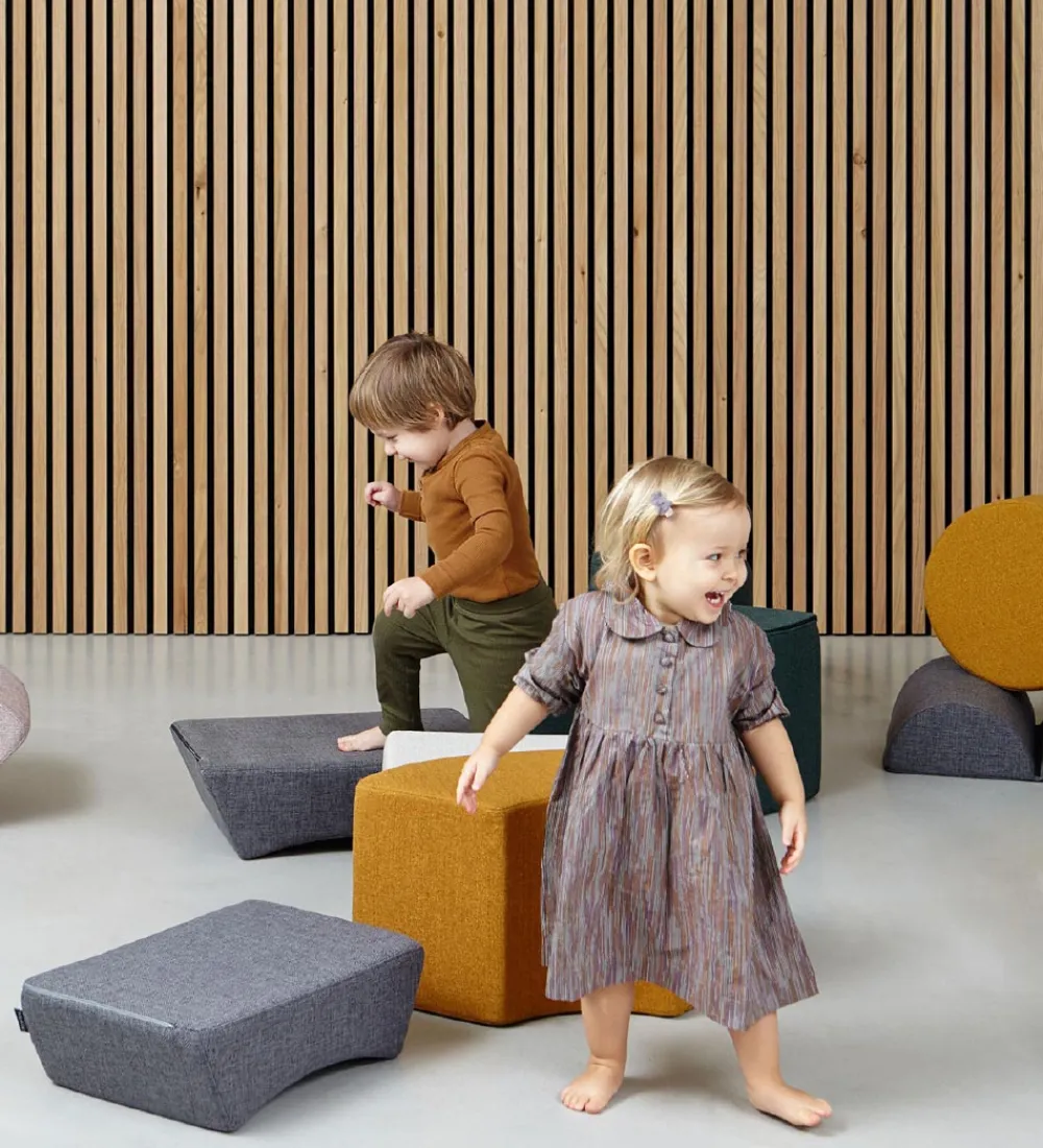 by Klipklap tumlemøblet har en aflang, firkantet form med en flad bund, og i toppen er der en rundet fordybning. Det lilla barn kan bruge det som en sjov forhindring, og tumlingen kan bruge den som en puf eller en skammel til at komme op i sofaen.