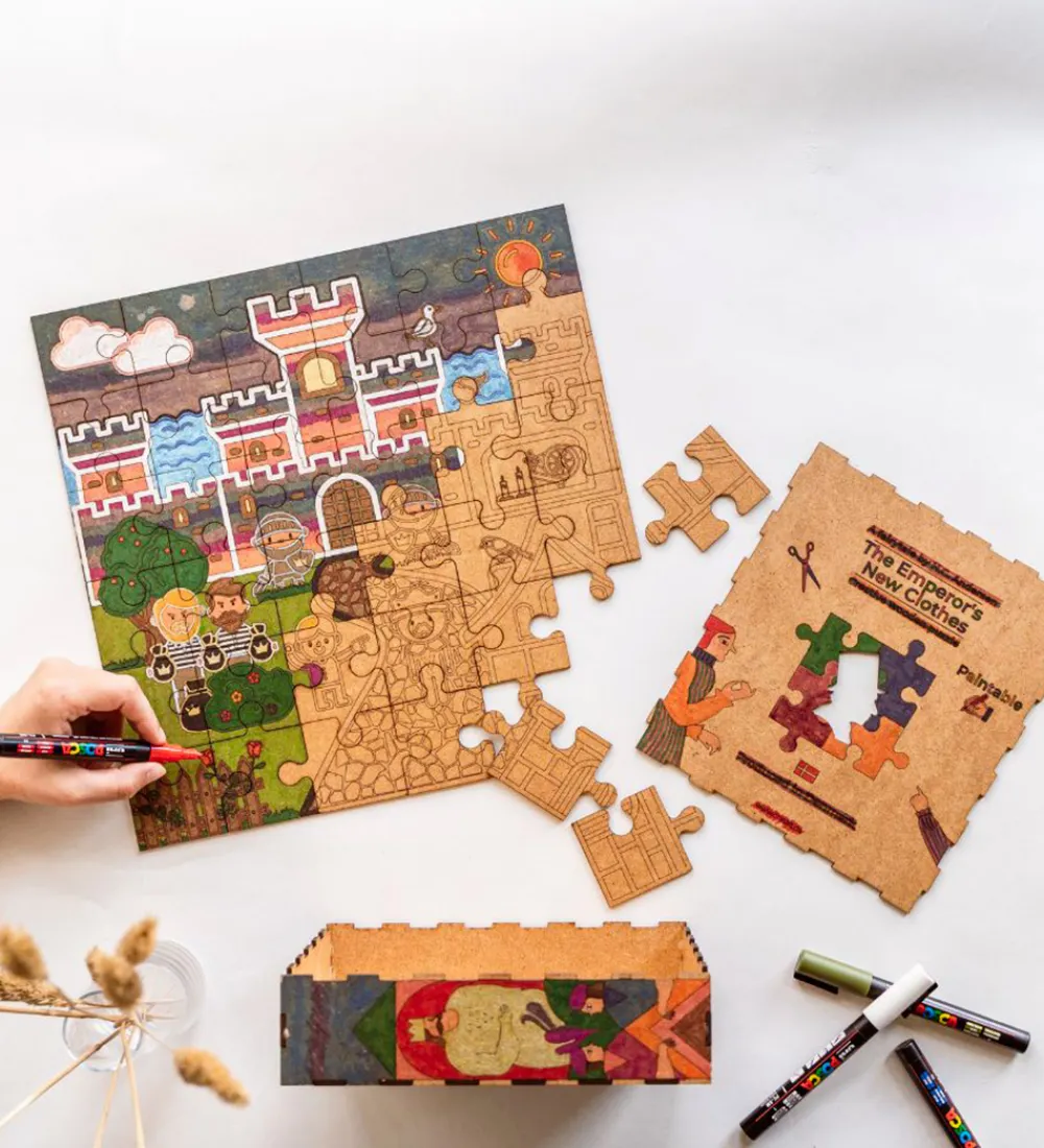 Crateit puslespillet består af i alt 36 brikker, der er lavet af umalet træ, som kan farvelægges med alle slags tuscher, maling og farveblyanter.