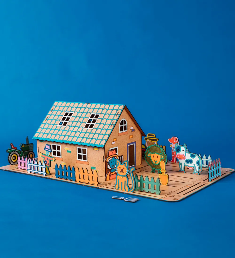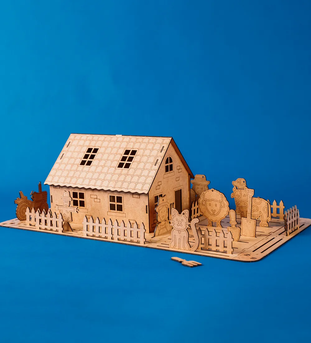 Hyggeligt Crateit kreatsæt i form af et bondehus og fine figurer af HDF-træplader i et bondehuset-tema.