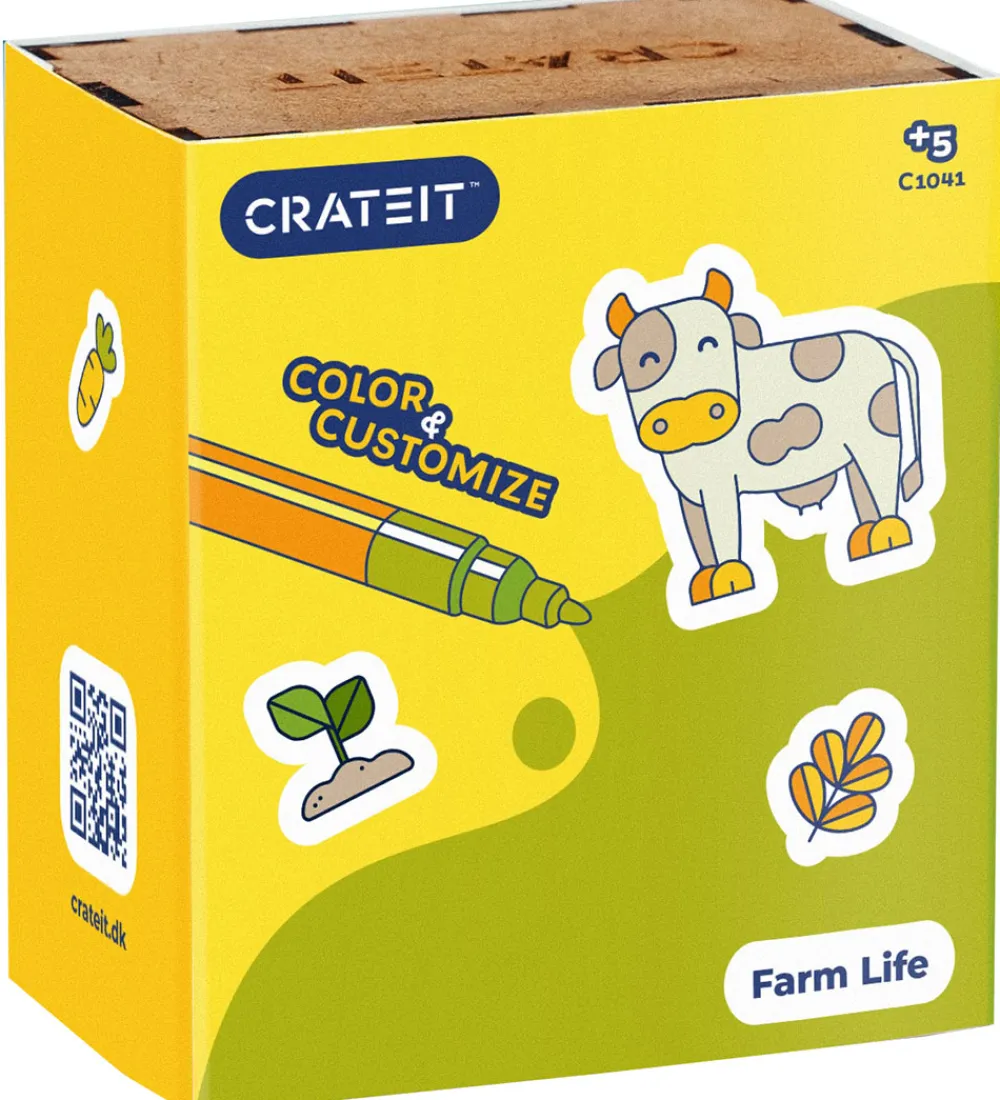 Crateit kreasættet består af i alt 15 figurer, heriblandt bondegårdsdyr, en traktor og tilbehør, der på smart vis kan sættes sammen. Crateit kreasættet er lavet af umalet træ, som kan farvelægges med alle slags tuscher, maling og farveblyanter.