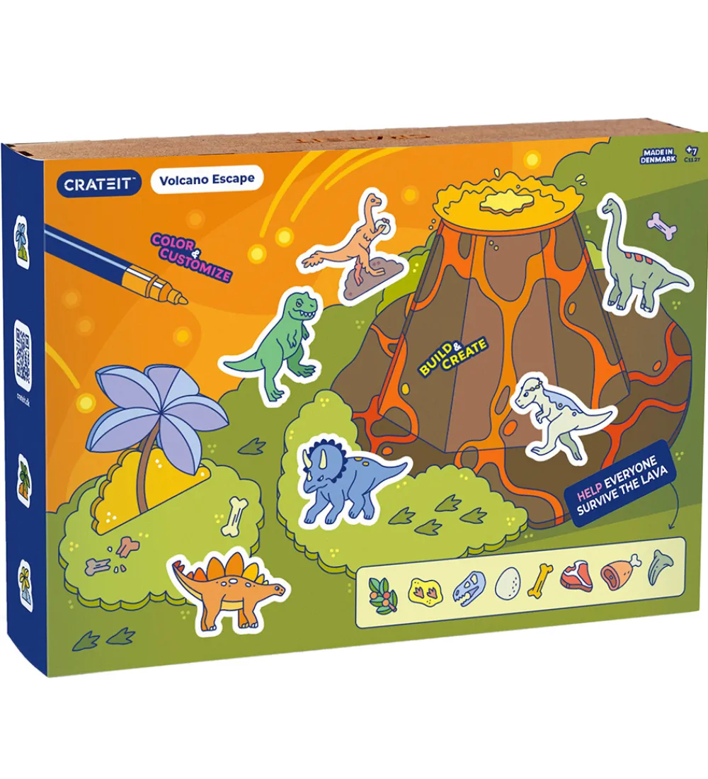 Crateit kreasættet består af i alt 1 byg-selv vulkan med udbrud, 5 figurer, 10 forskellige planter, kød og knogler, der på smart vis kan sættes sammen. Crateit kreasættet er lavet af umalet træ, som kan farvelægges med alle slags tuscher, maling og farveblyanter.