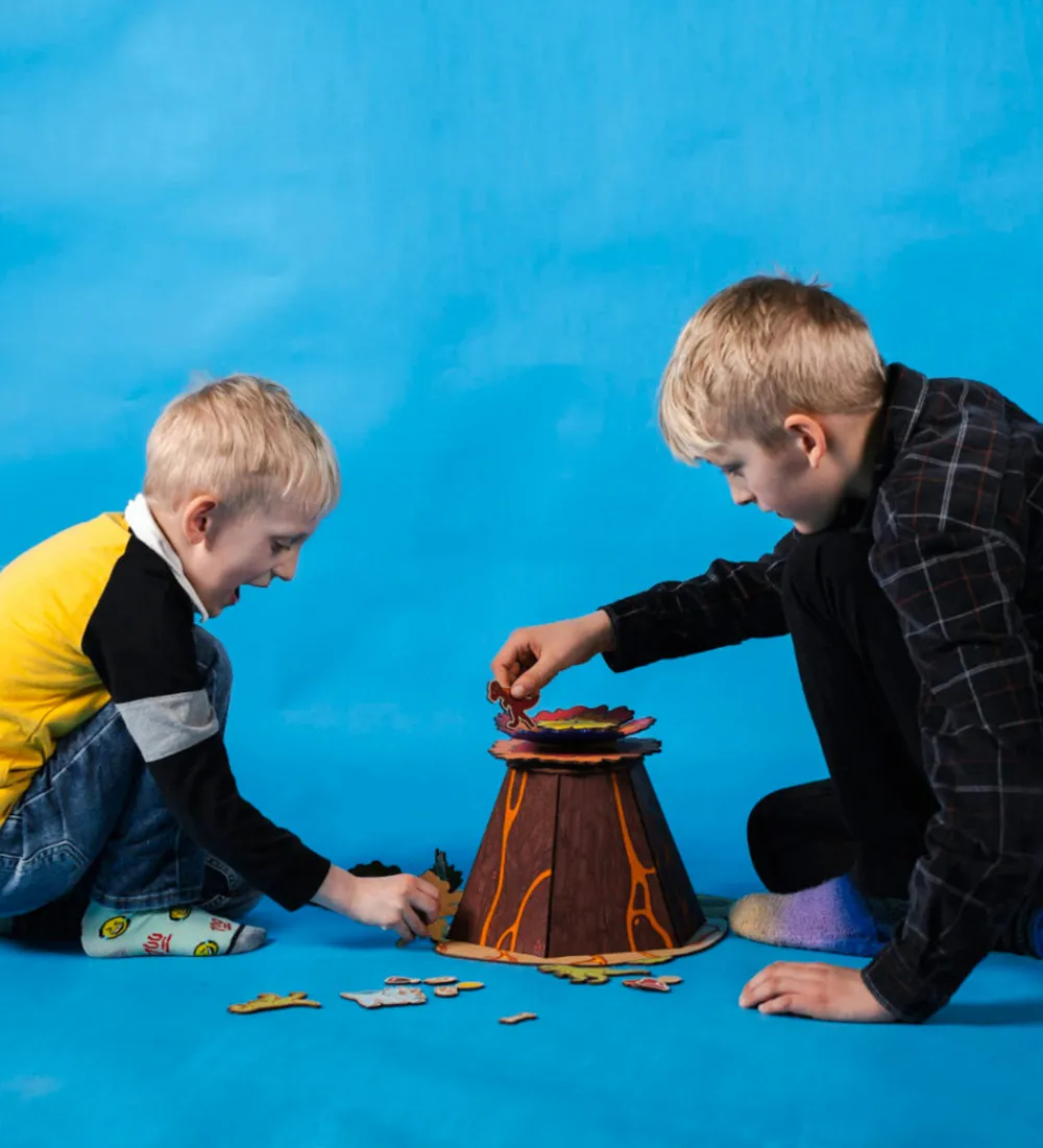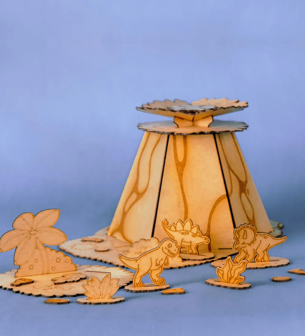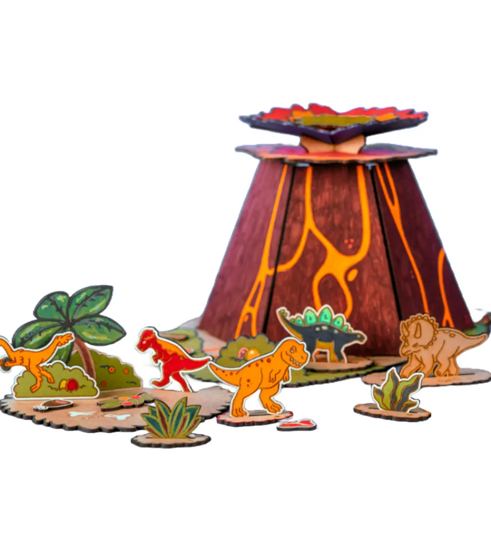 Hyggeligt Crateit kreatsæt i form af en vulkan og fine figurer af HDF-træplader i et flugt fra vulkanen-tema.