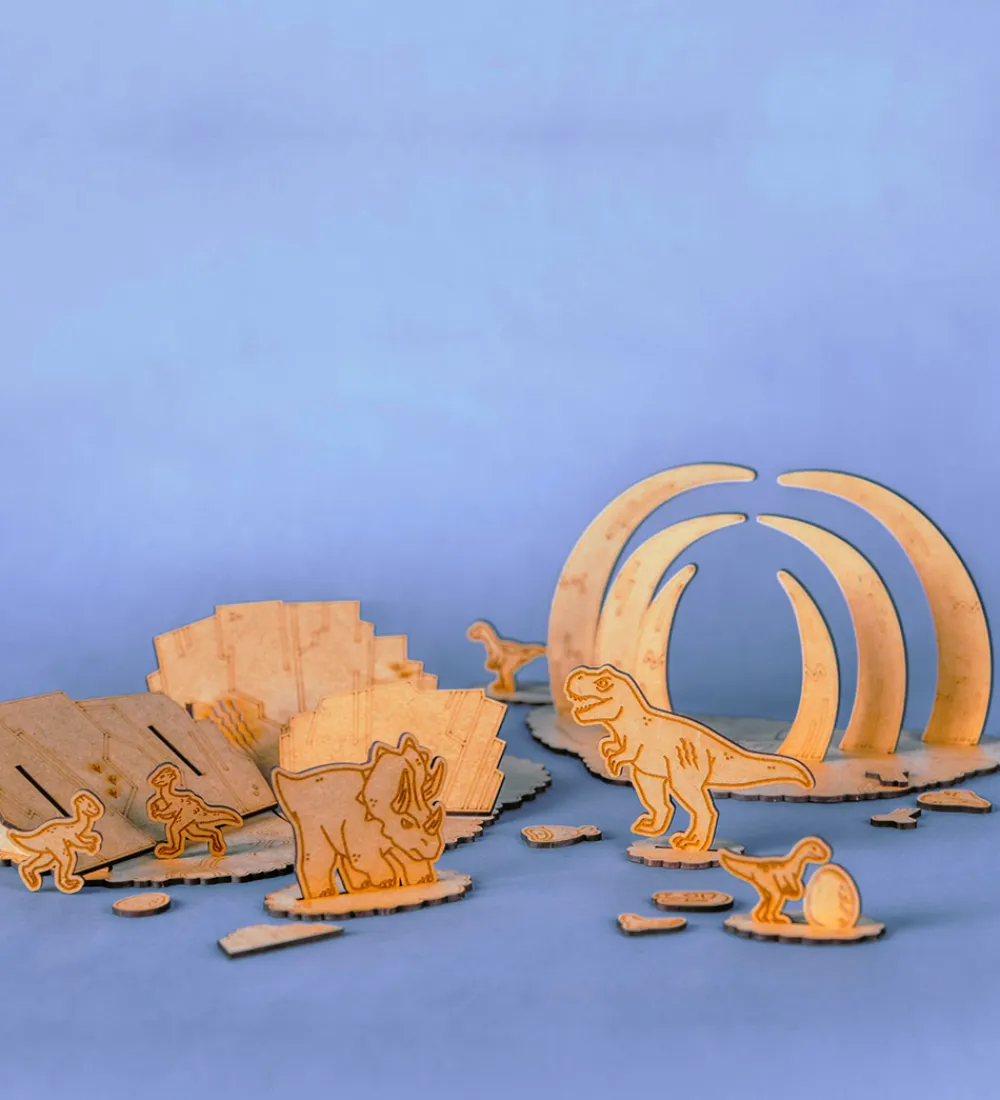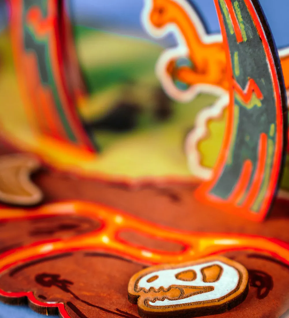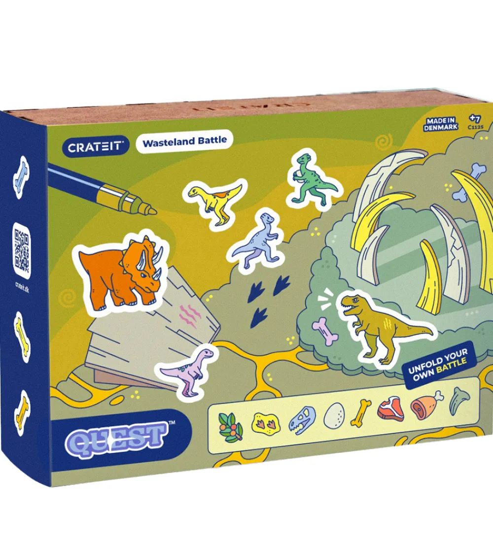 Hyggeligt Crateit kreasæt, hvor der skal bygges og farvelægges en ødemark med dinoer i kamp i HDF-træplader.