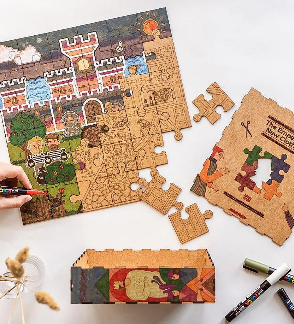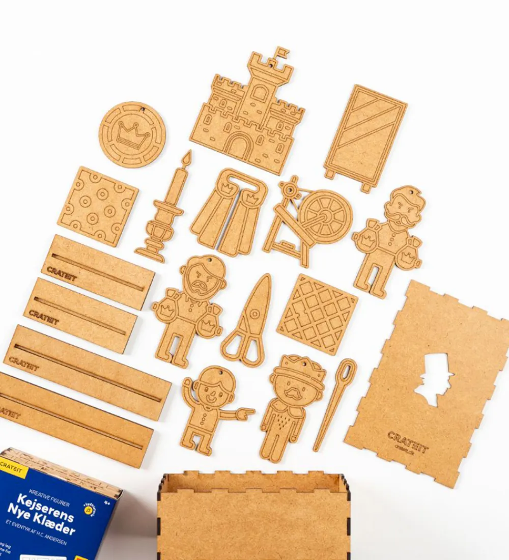 Hyggeligt Crateit kreatsæt i form af fine figurer af HDF-træplader i et Kejserens nye klæder-tema. Til kreasættet har Crateit også lavet en lydhistorie; H.C. Andersens klassiske eventyr “Kejserens nye klæder”, som børnene kan lytte til på Crateits hjemmeside, mens de farvelægger kreasættet. Lydhistorien er på dansk.