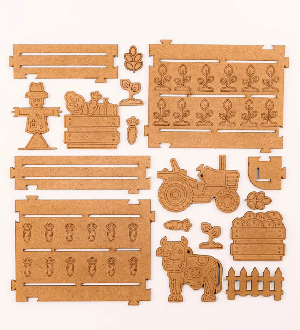 Crateit kreasættet består af i alt 4 marker, 18 hegn og 5 figurer, heriblandt en traktor og tilbehør, der på smart vis kan sættes sammen. Crateit kreasættet er lavet af umalet træ, som kan farvelægges med alle slags tuscher, maling og farveblyanter.