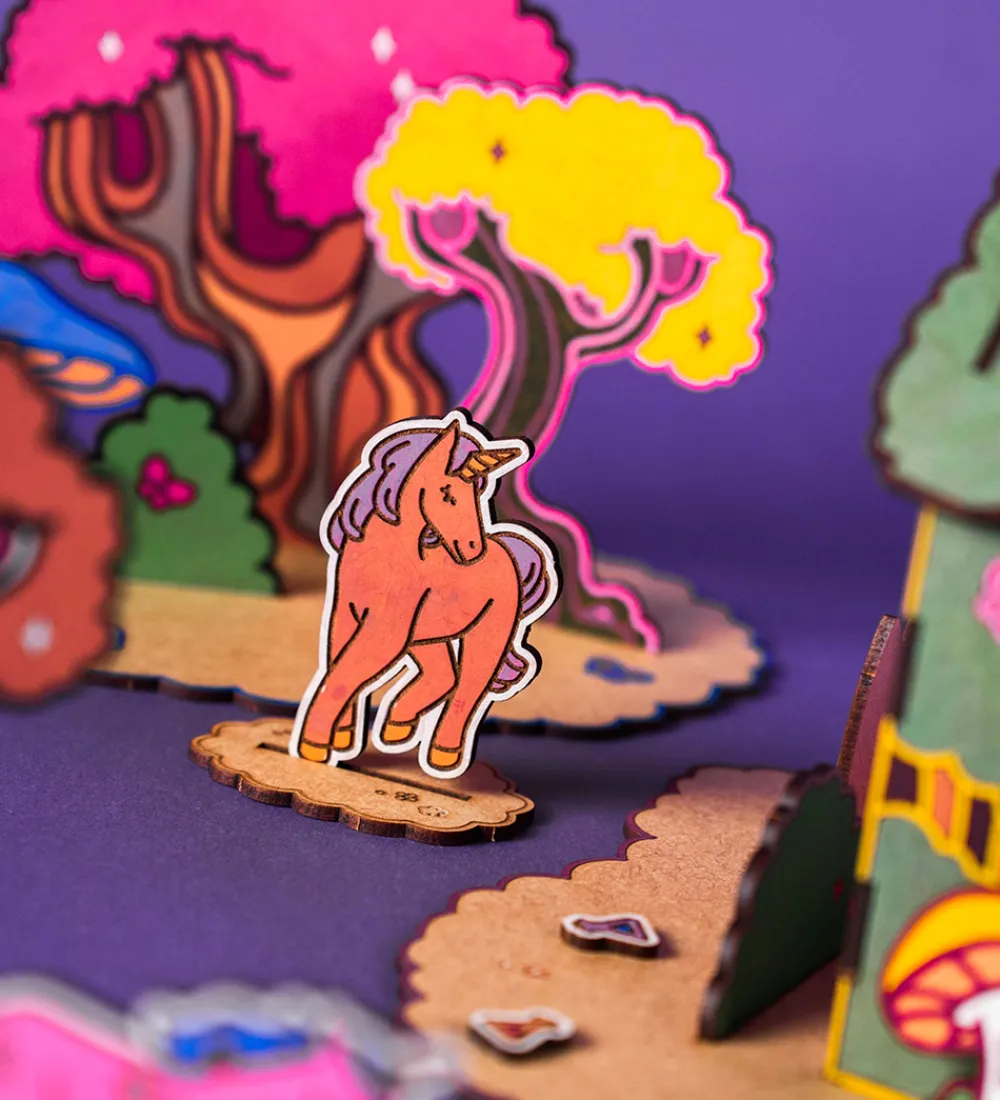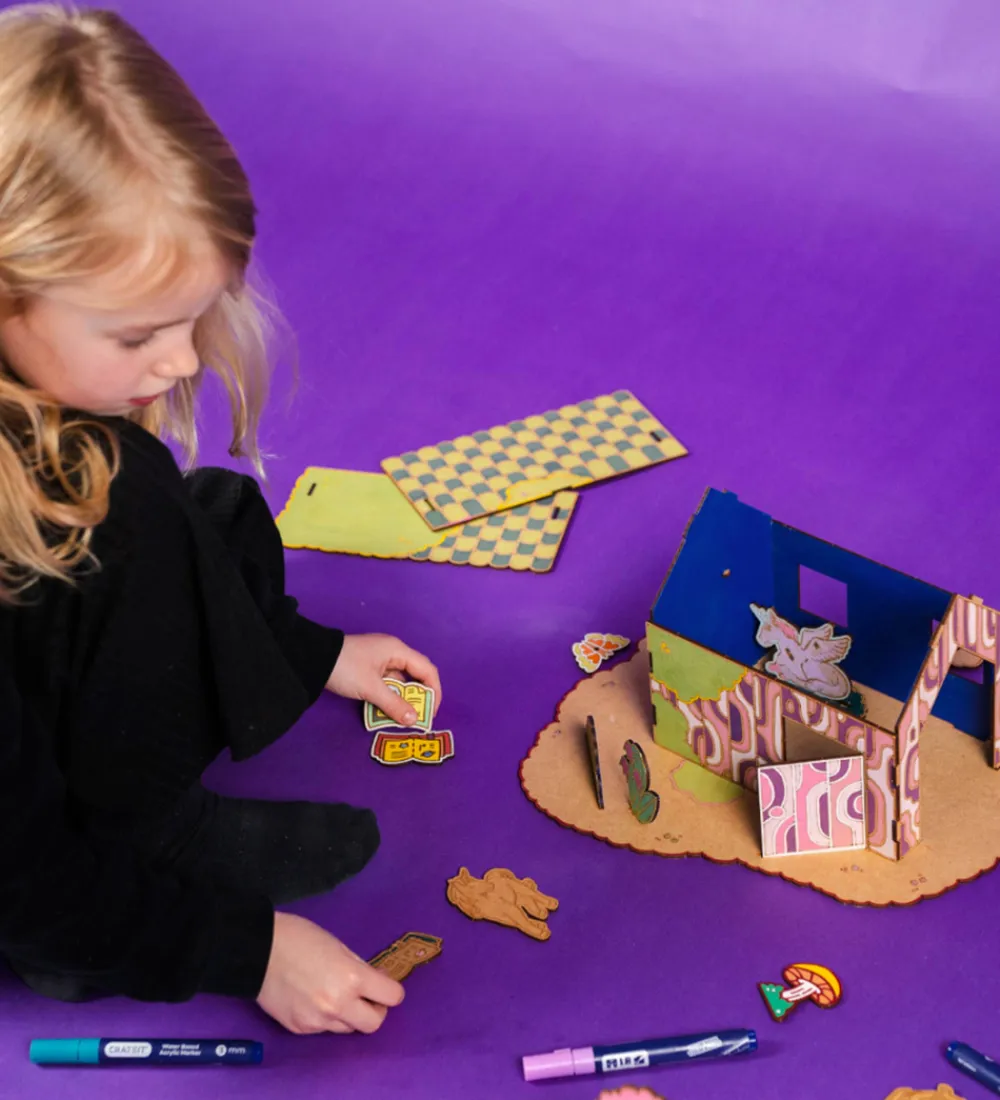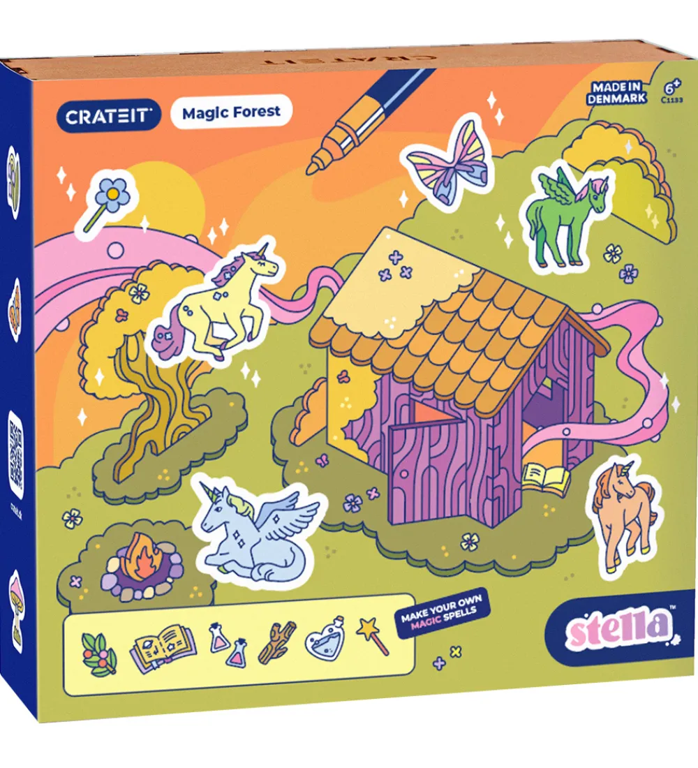 Crateit kreasættet består af i alt 1 byg-selv skovhus med 3 store træer, 5 figurer, heriblandt enhjørninge med tilbehør, og 10 forskellige planter, frugter og tryllesager, der på smart vis kan sættes sammen. Crateit kreasættet er lavet af umalet træ, som kan farvelægges med alle slags tuscher, maling og farveblyanter.